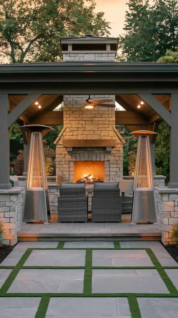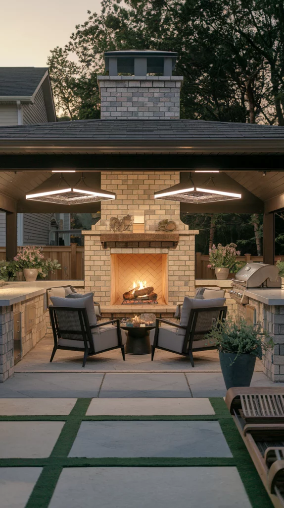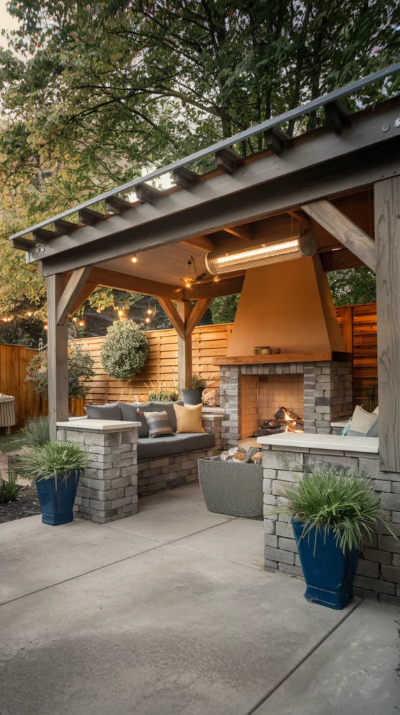 Extend the usability of your BBQ shelter into cooler seasons with outdoor heating features. These shelters can include built-in fireplaces, heaters, or fire pits to keep the area warm and inviting. Pair heating elements with cozy furniture and soft lighting to create a welcoming ambiance for year-round grilling.