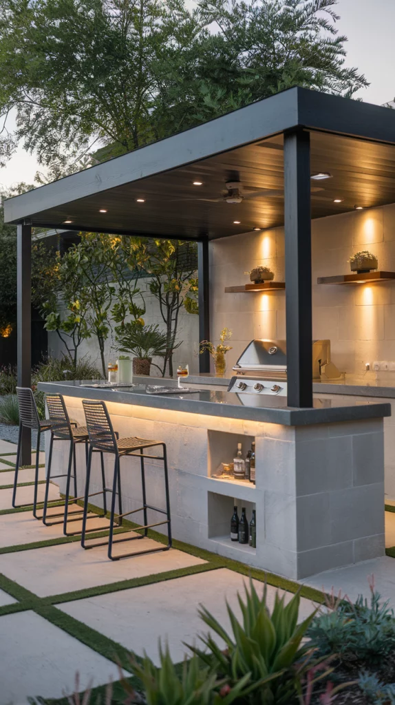 For the ultimate outdoor entertainment space, a BBQ shelter with a built-in bar area is the perfect choice. These designs incorporate bar counters, stools, and shelving for drinks and accessories. Combine it with ambient lighting and stylish decor for a lively and functional social hub.