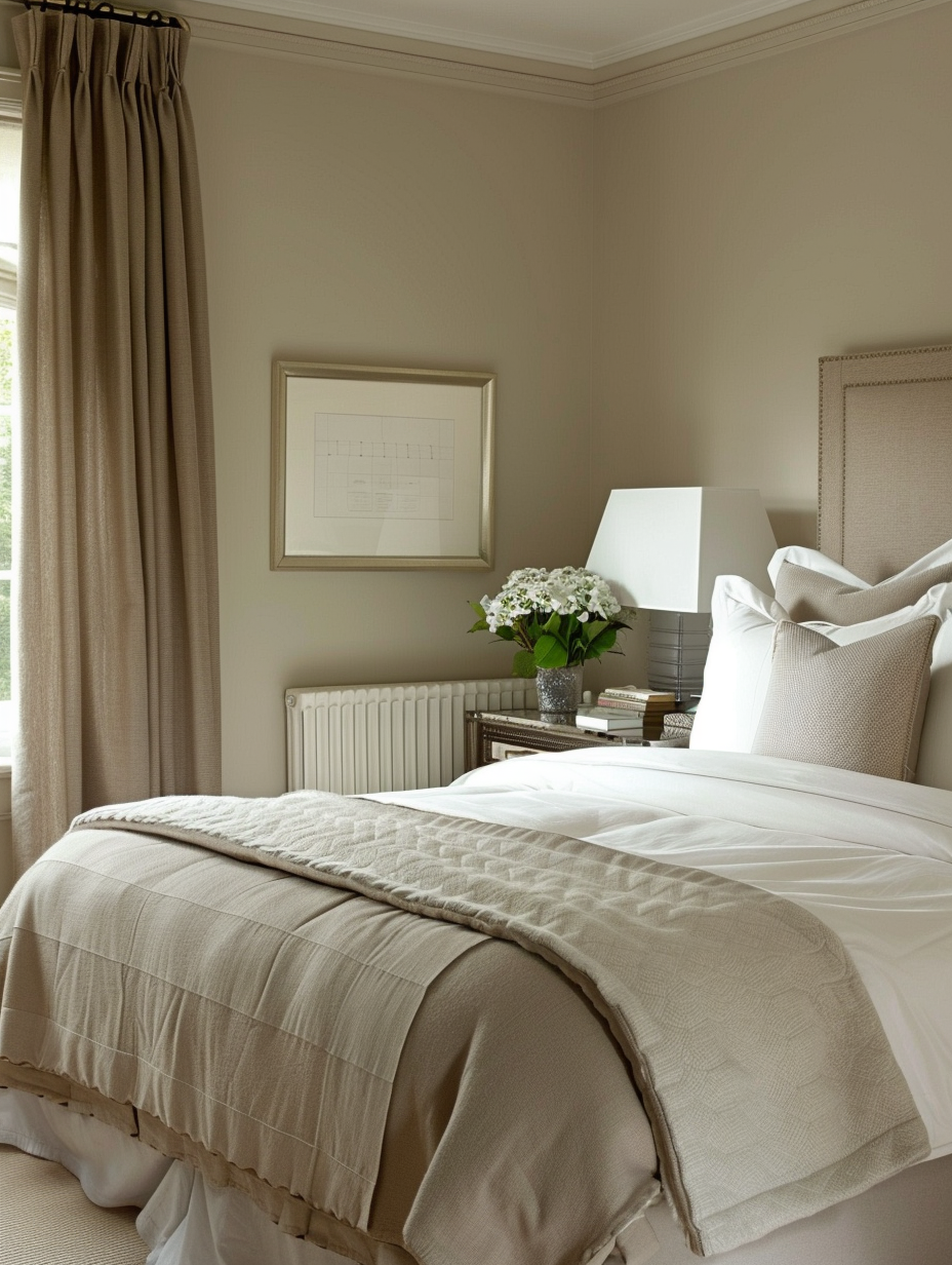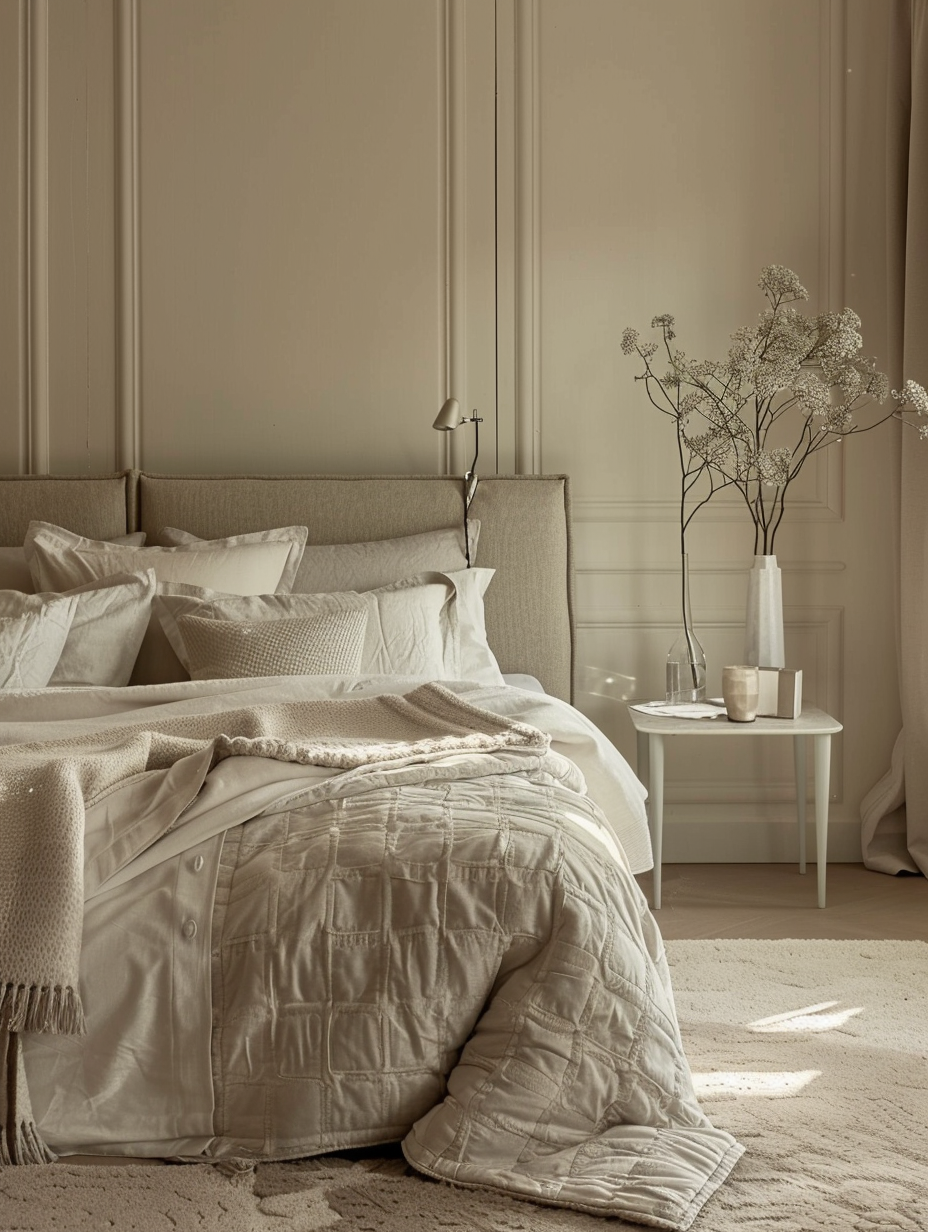 Neutral color schemes can never be obsolete and they convey a peaceful, soothing atmosphere for your bedroom. Introduce hues of beige, ivory, and taupe to get a stylish appearance. Pair them together with a gray headboard, tender bedclothes, and simple decorative elements to keep all the polished yet unshowy impressions. Optimizing neutral palettes is the best choice for people who like a clean, minimalistic look.