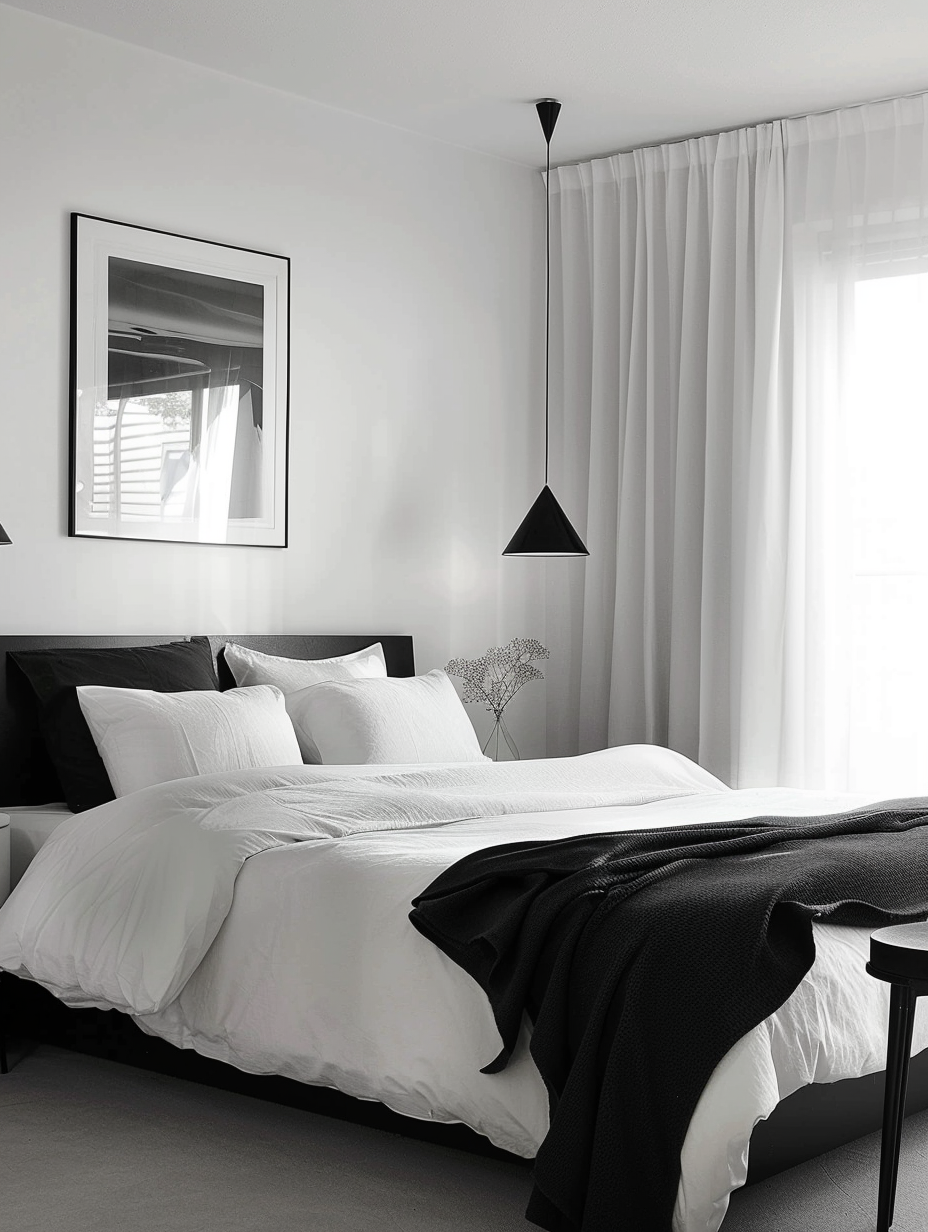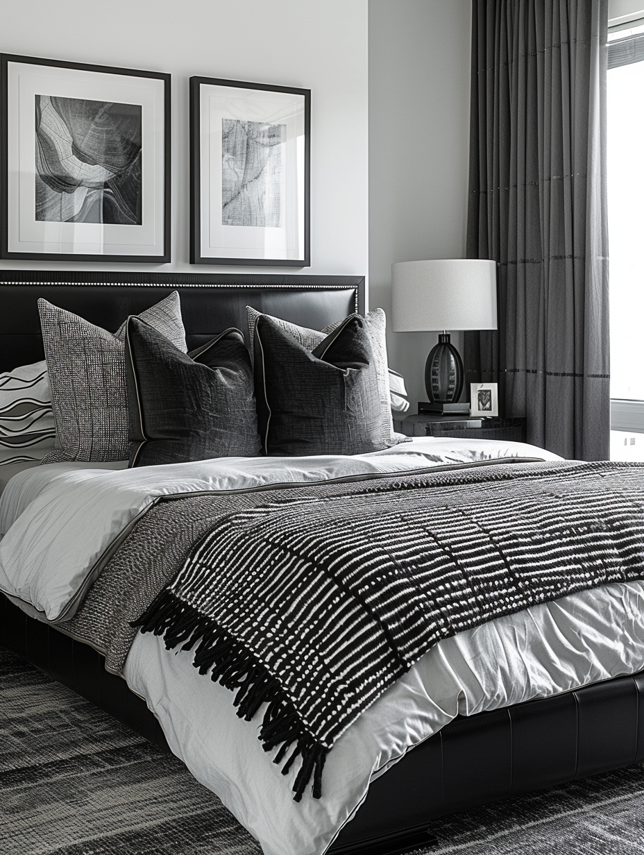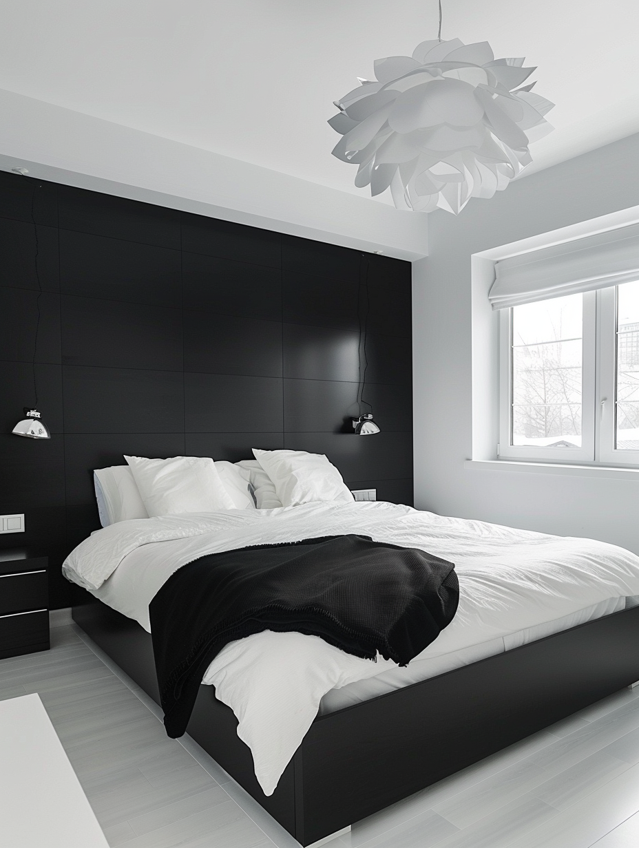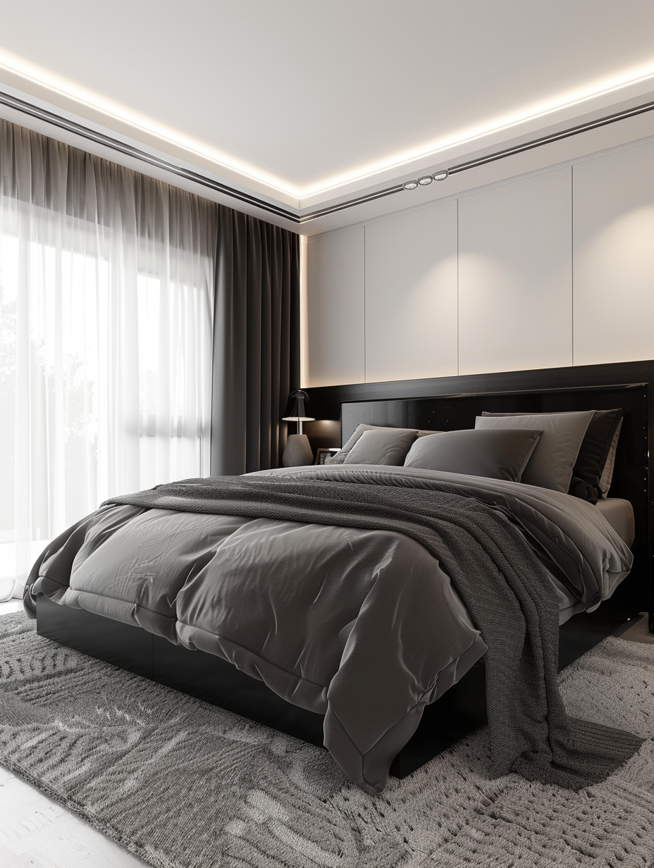 Monochromatic schemes are perfect for bedrooms that look “sophisticated.” The bed linen of black, white, and gray colors will be a trendy and modern interior decoration. Adding different tactile and patterned surfaces will bring depth and liveliness to the room. Black furniture, white walls, and grey pieces will give the room a glamorous and original look. This solution includes a contemporary theme of bedroom interior design.