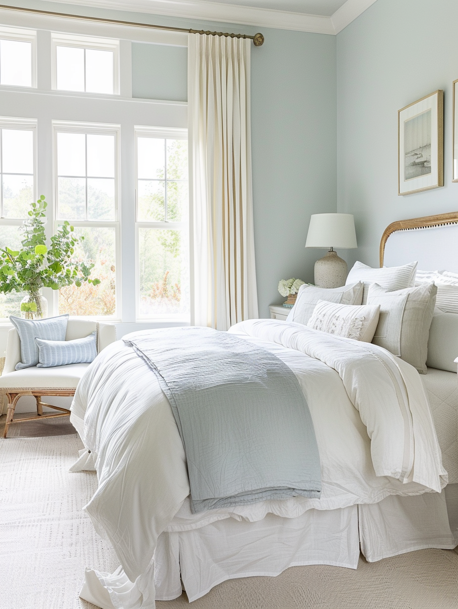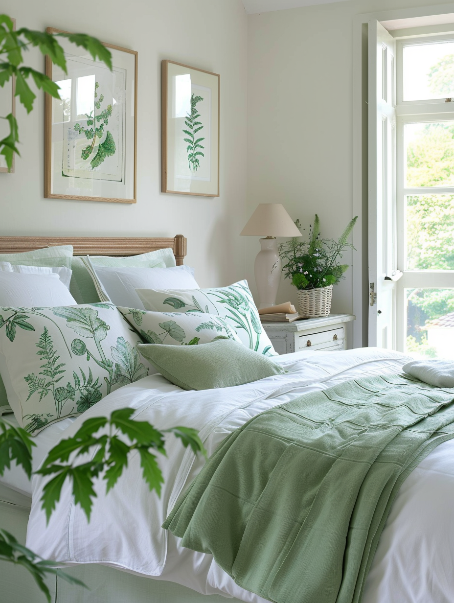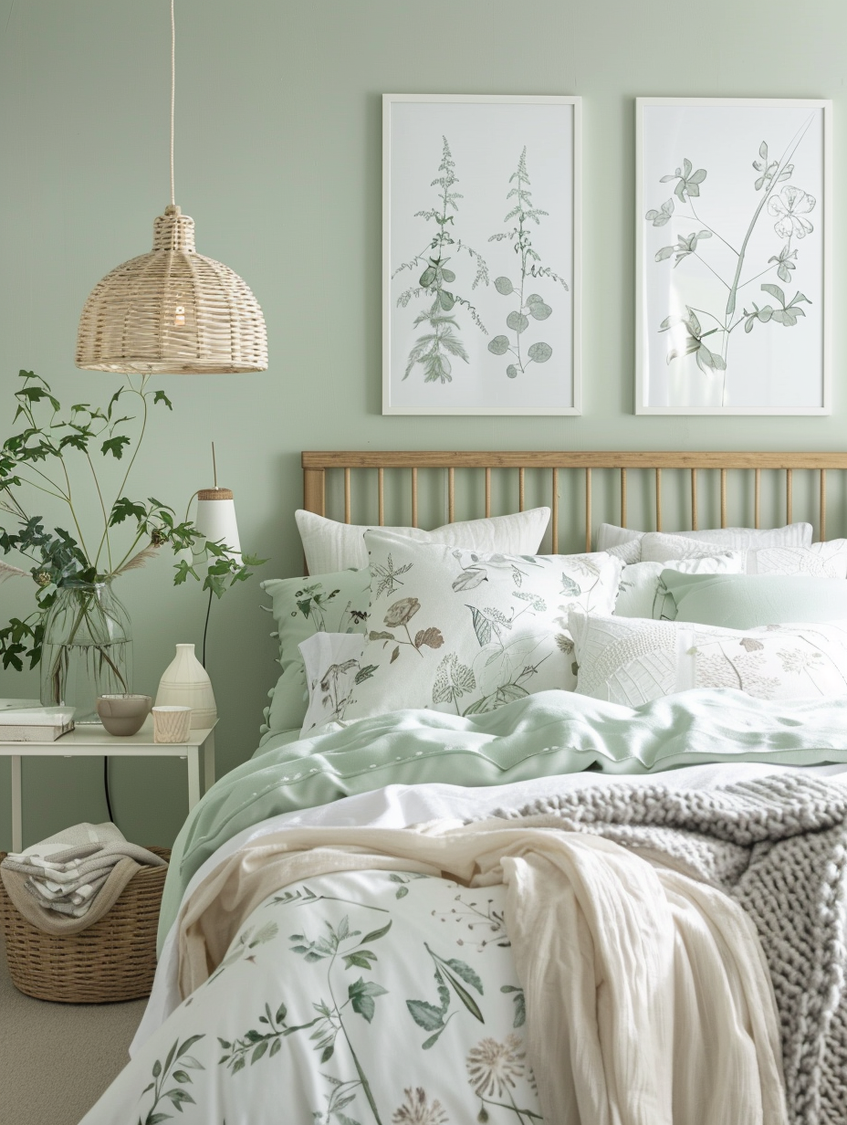 Green is the predominant color throughout nature and has many life-giving characteristics. Bring a sense of peace to your bedroom by using bright color tones like pale green that go well with white or light wooded furniture. Besides that, to further animate, use a botanic print of the fabrics and surfaces. This paint pairing is perfect for the look you’re going for with the balance of nature and healing energies in the room.
