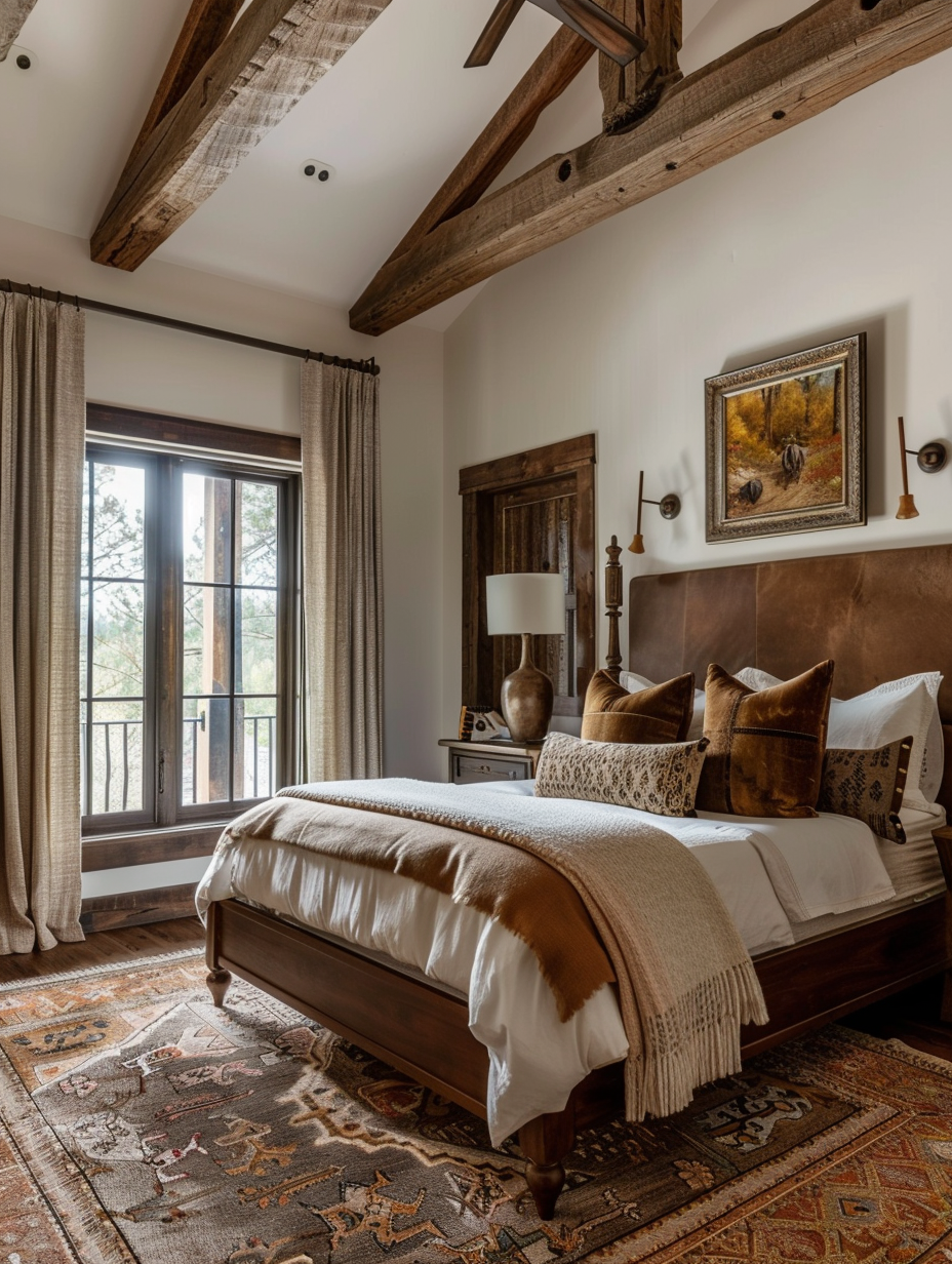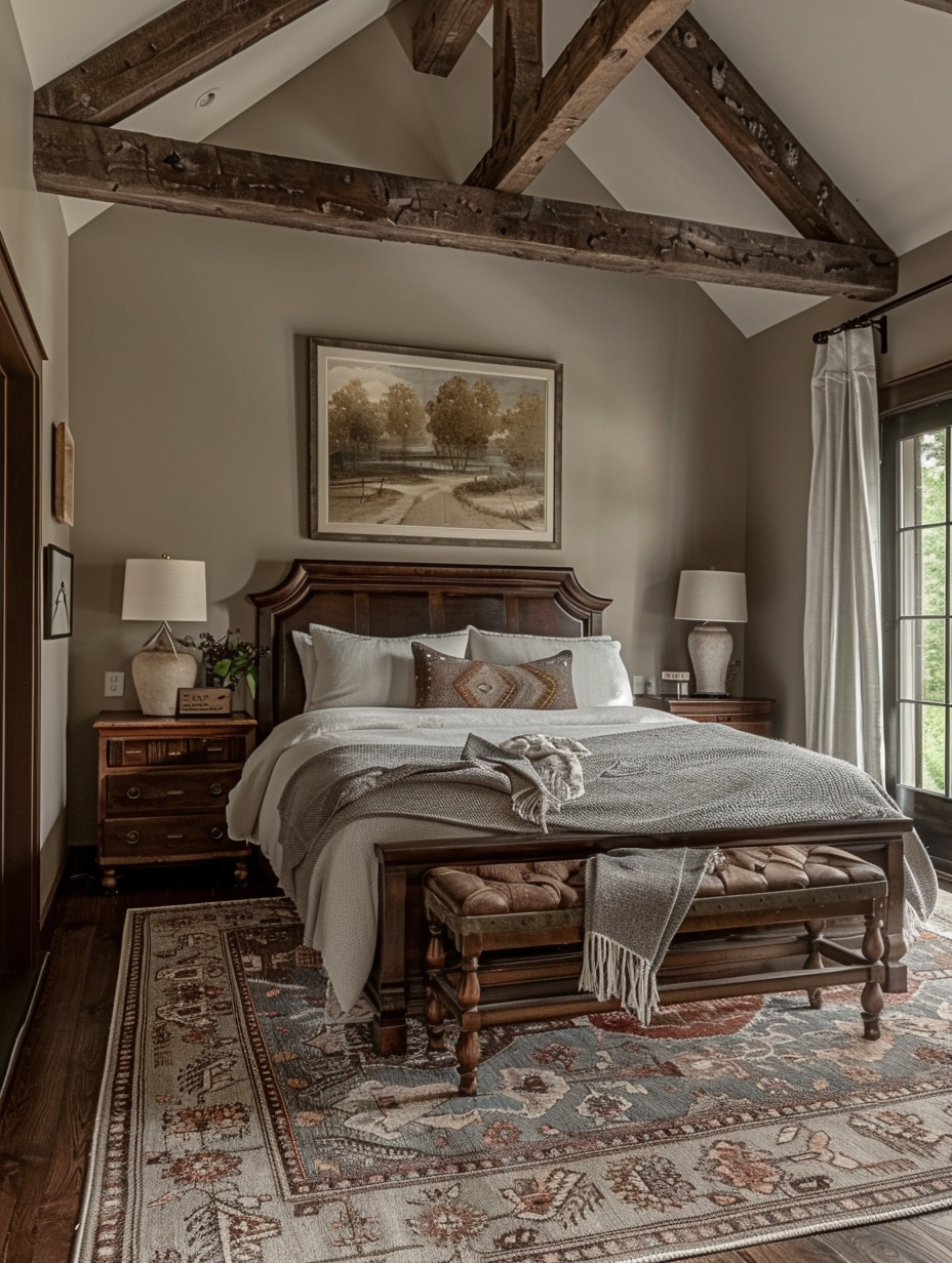 Channelling of unrefined and earthy atmosphere into your room is recommended to the palette of warm brown and earth colors. You can also consider dark wood furniture, majestic beams, or fine wool rugs. Contribute cosiness with the dark brown walls and mix them with beige or cream bedding. The given color scheme is perfect for creating a warm, welcoming, farmhouse, or a rustic hideaway.