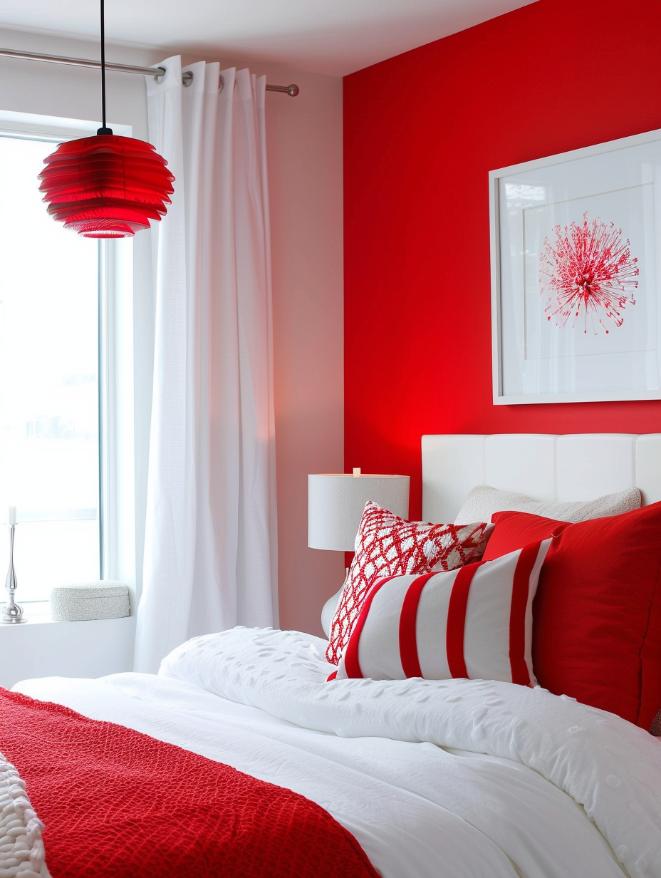 Red is an opportunity for a bold bedroom like no other and it gives a strong statement. Create an accent wall or through bedding and decor. Neutral colors in white or beige furniture as well as simple decorations should help you keep everything in equilibrium. This is a color scheme recommended to those looking for a dramatic and lively room makeover.