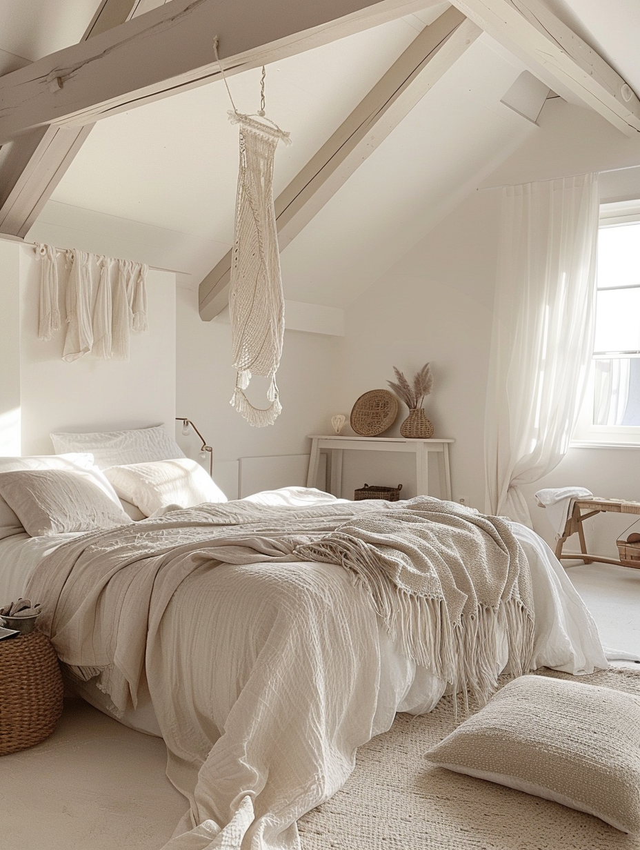 To add bohemian energy to a boudoir, you could combine different bright and quirky shades. The good combos are apple-red, eggplant-purple, and fire-red with such fabrics as macramé wall rugs, patterned carpets, and sulfate pillows. You can add organic accents like wicker chairs and pots with vegetation to show off a relaxed bohemian mood.