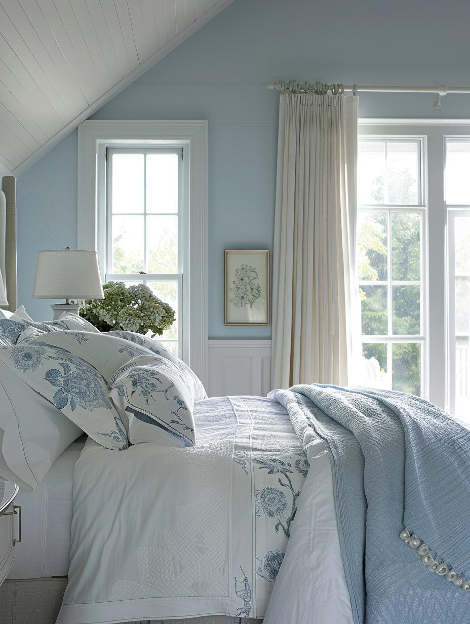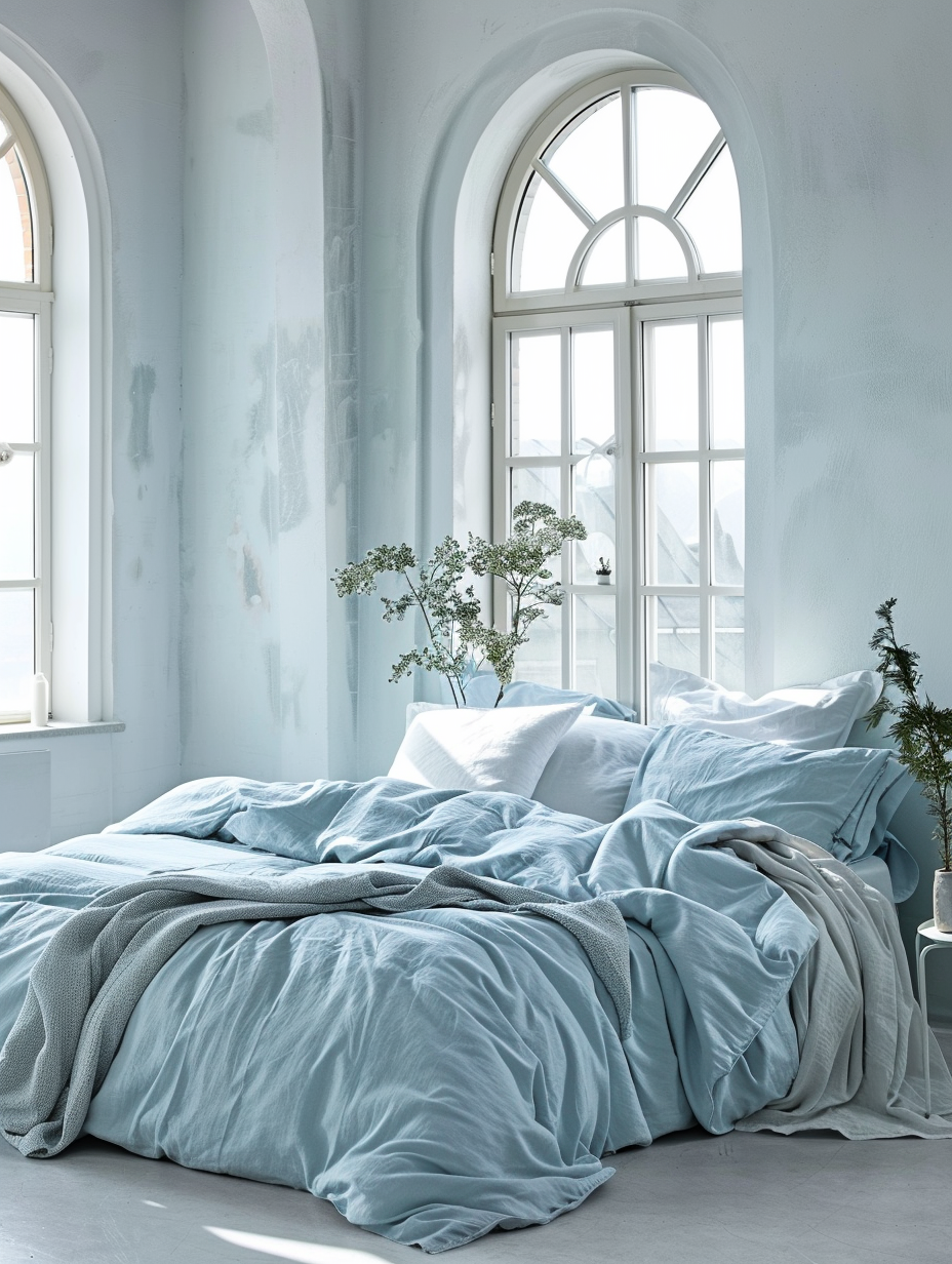 Light and soft colors–using blues, whites, and pale grays–that are not overly bold can brighten up your bedroom making it feel fresh and open. Applying these tones to the walls, bedding and decoration effectively makes the room lighter and more visually spacious. This variety of colors will have a likely success in a loft or a small apartment that looks so much larger and comfortable!
