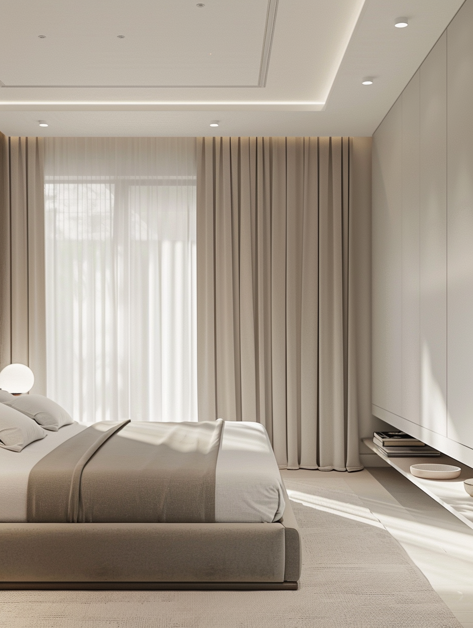 To achieve a minimalist look and a peaceful environment, go for a more simplistic style with a monochrome color scheme. Whites, light grays, and subtle beige tones bring a tranquil and large breathing room. Use just basic furniture with clear lines and almost no accessories to support the minimalist style. This idea is an excellent solution for users who like a modern and minimalist interior.