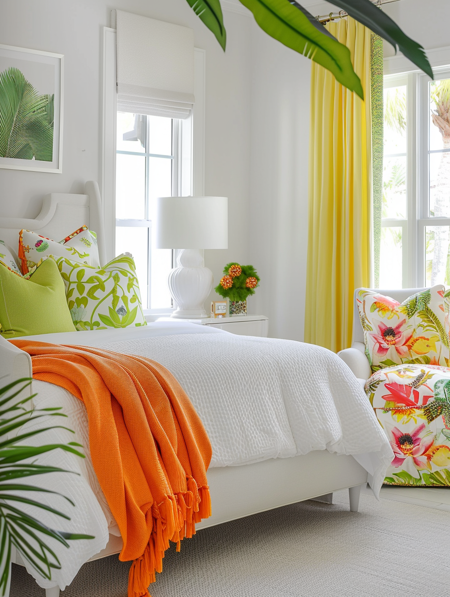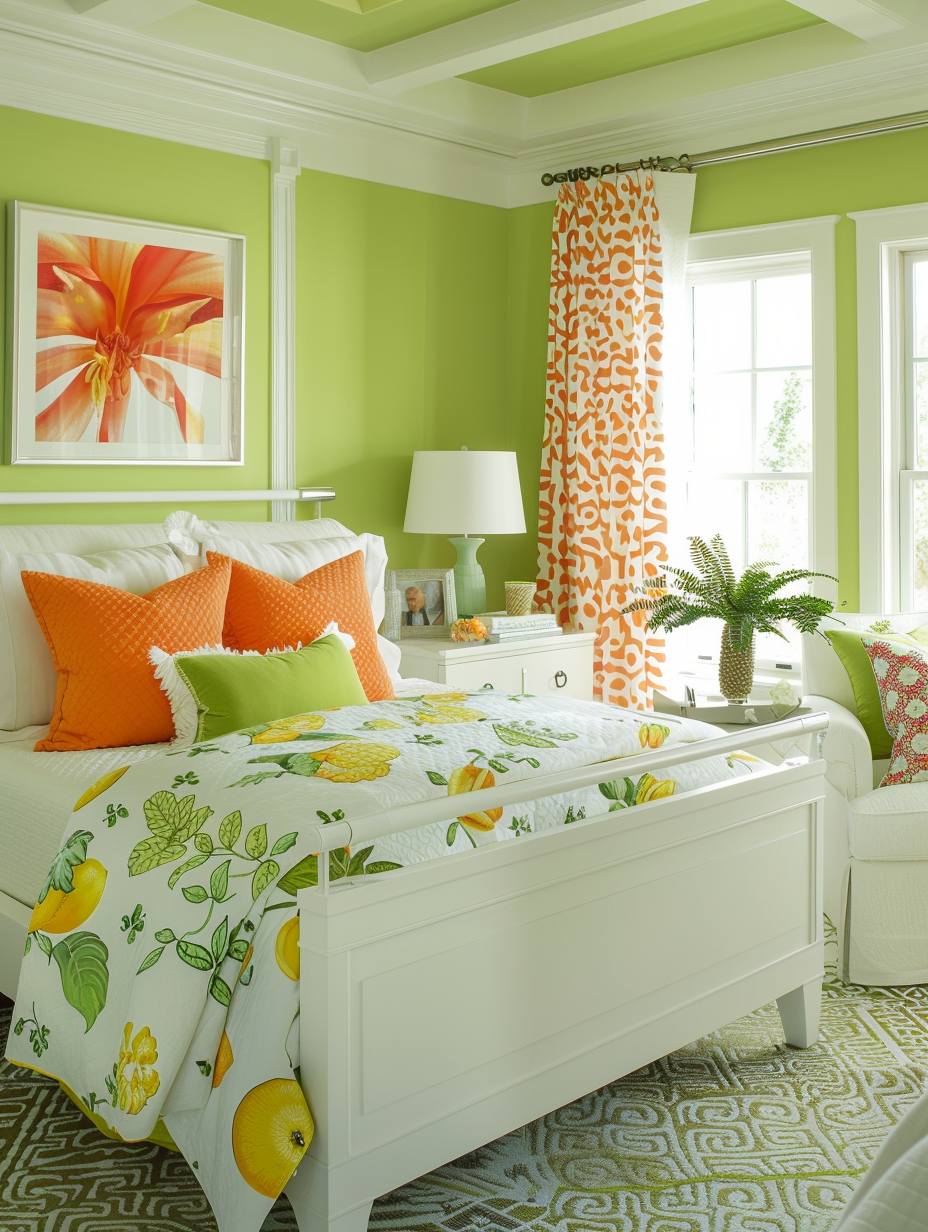 The citrus colorway that ranges from lemon yellow, lime green, and tangerine orange is what will be able to create an energized look in your bedroom. These lively color tones are great for accent walls, bedding, and decorative items. Contrast these with the white or neutral furniture to create that bold, yet balanced, and well-put-together look. This palette is great for bringing an energetic and exhilarating air to the room.