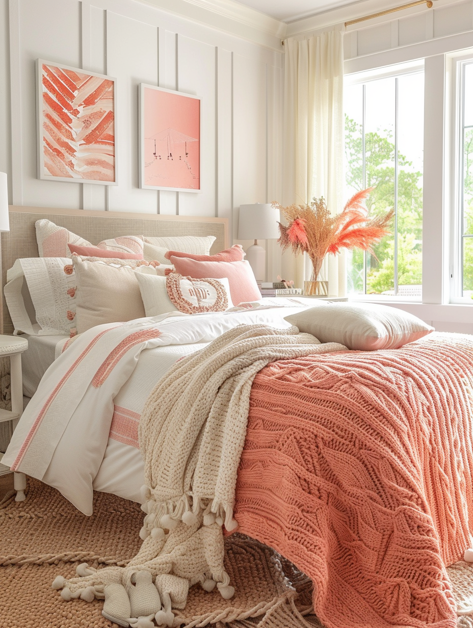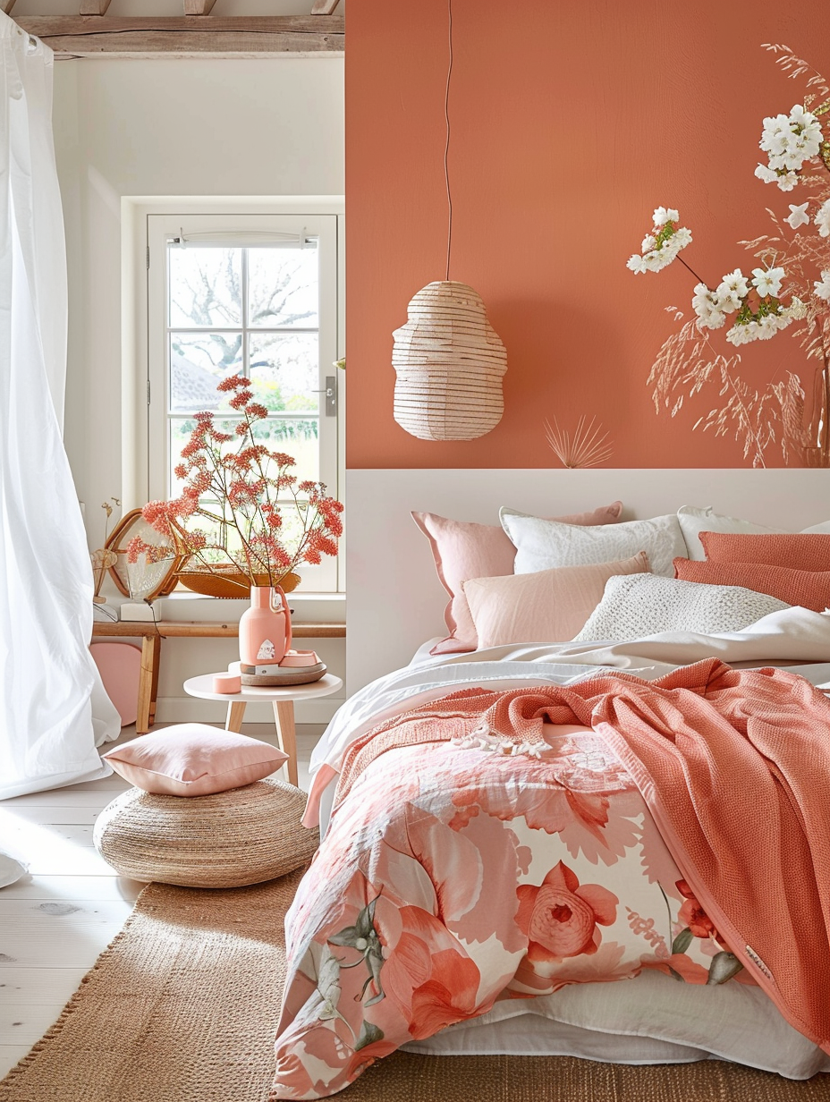 An excellent way to give the bedroom a cozy and pleasant feel is to use coral and peach tones. Even if you just spread these colors on the walls or through simple accessories, it will immediately brighten the room. To keep the look balanced, you should combine these colors with either white or neutral-toned furniture. This color pattern is well suited to achieve an inviting and lively setting.