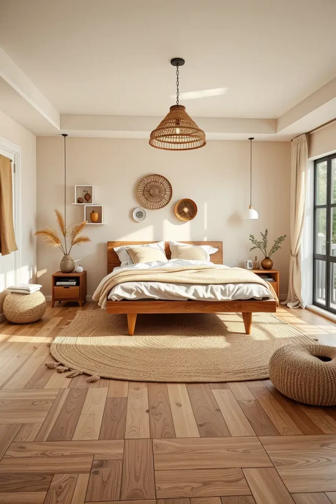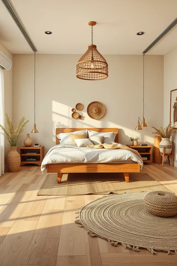 In such interior, I tend to choose a matte sand-colored finish on the walls and oak floors and natural fabrics. The wooden platform bed with linen sheets, rattan details, and ceramic decor elements add to the further creation of the laid-back and natural atmosphere. The walls are painted in neutral colors in such a way that the artwork or the lighting fixtures can be silent focal points without causing visual clutter.