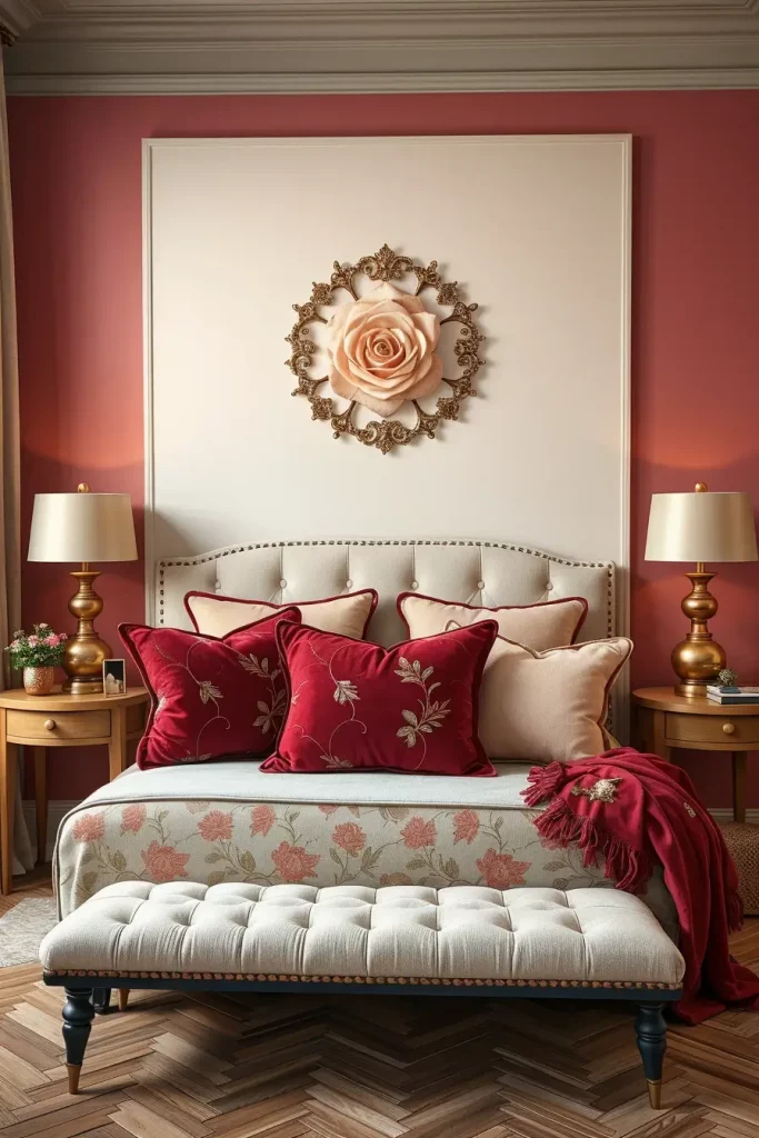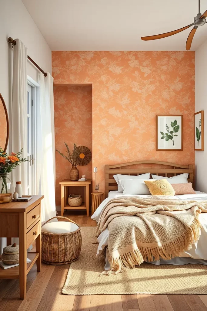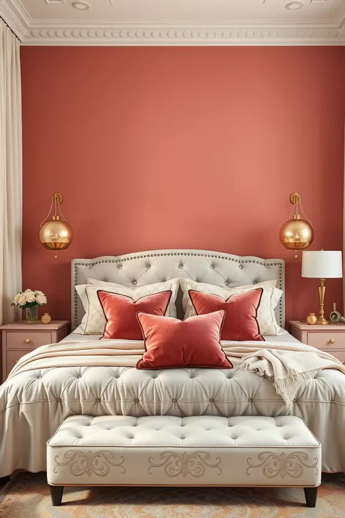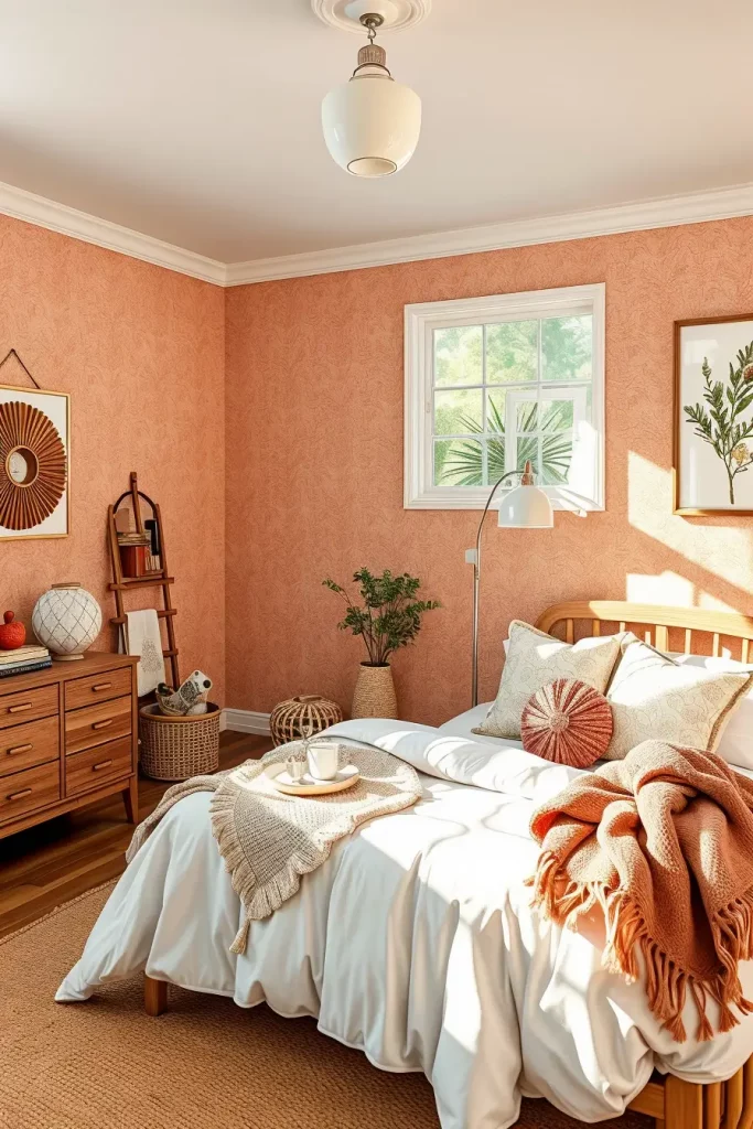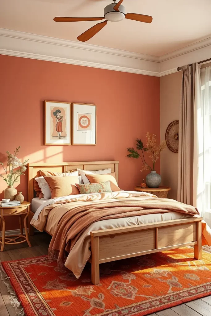 In a bedroom with a coral-and-clay palette, I tend to combine a subtle coral wall with textiles that are clay-toned-think terracotta pillows, rust-colored rugs, and clay ceramic lamps. The saturation is balanced by cream or peach bedding and a natural wood bed frame serves to ground the palette. I tend to employ light rattan or bamboo to make the mood relaxed but fashionable.