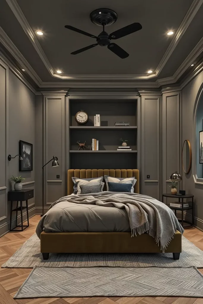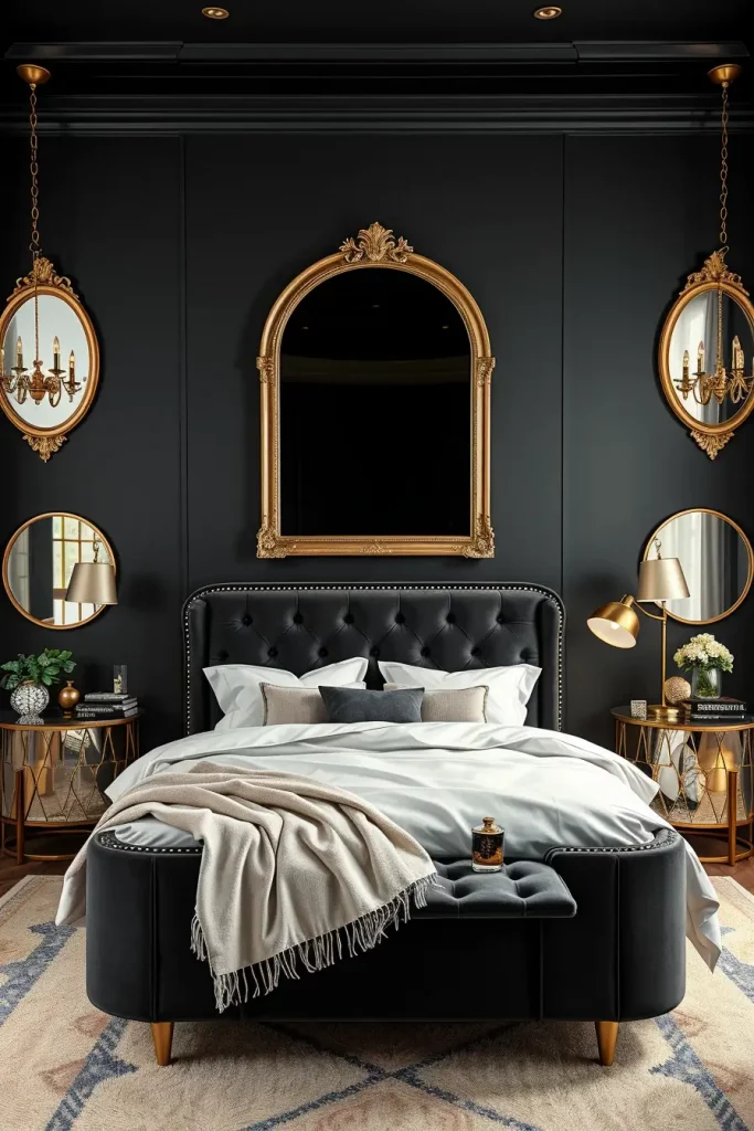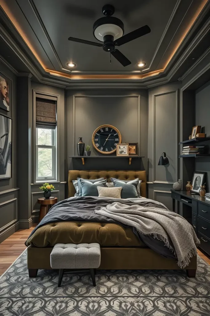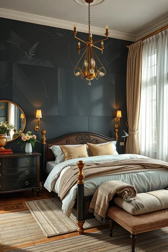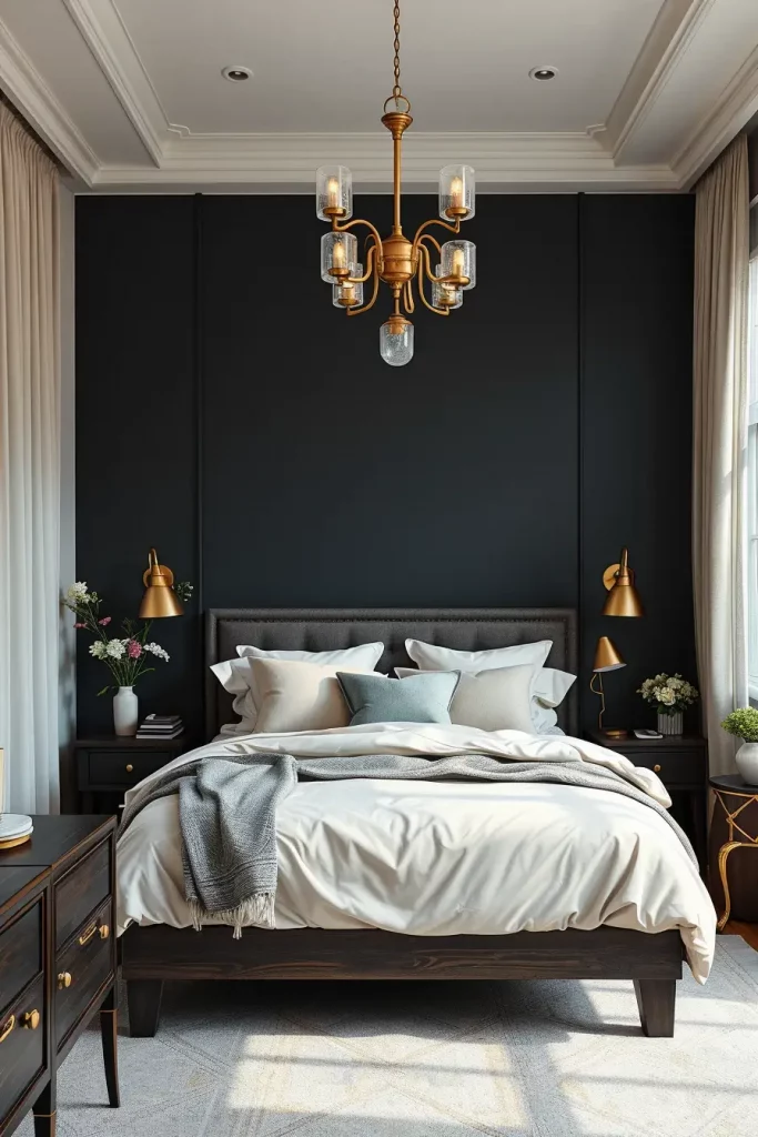 I tend to paint one wall deep charcoal and balance it with light white or cream-colored bedding. Dark wood or matte black bed frames would look good here, and metallic accents, such as brass or gunmetal, can take the whole design to the next level. Such elements as light fixtures and artwork should be employed in a strategic way so that the room does not feel too heavy.