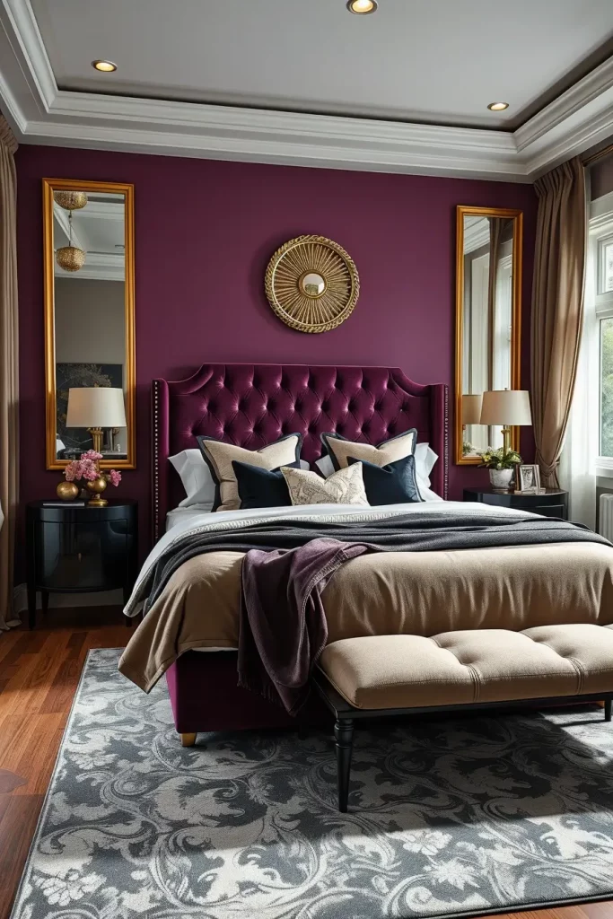 Deep plum and aubergine are one of the most luxurious bedroom color trends 2025. These deep, jewel-like shades make the atmosphere moody but glamorous and indulgent and stylish. I especially enjoy them in master bedrooms or rooms with a lot of windows where the natural light can offset the intensity of the color.
