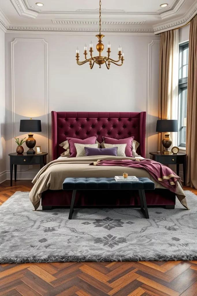 I tend to put velvet headboards in bedrooms with plum or aubergine walls, in a similar or a little lighter shade. Sculptural lamps on black or brass side tables aid in unifying the appearance, and off-white or taupe bedding keeps the palette too dark. The whole space is anchored by a soft wool rug in gray or lilac color. The opulent fabrics like silk curtain and shininess add to the refined ambiance.