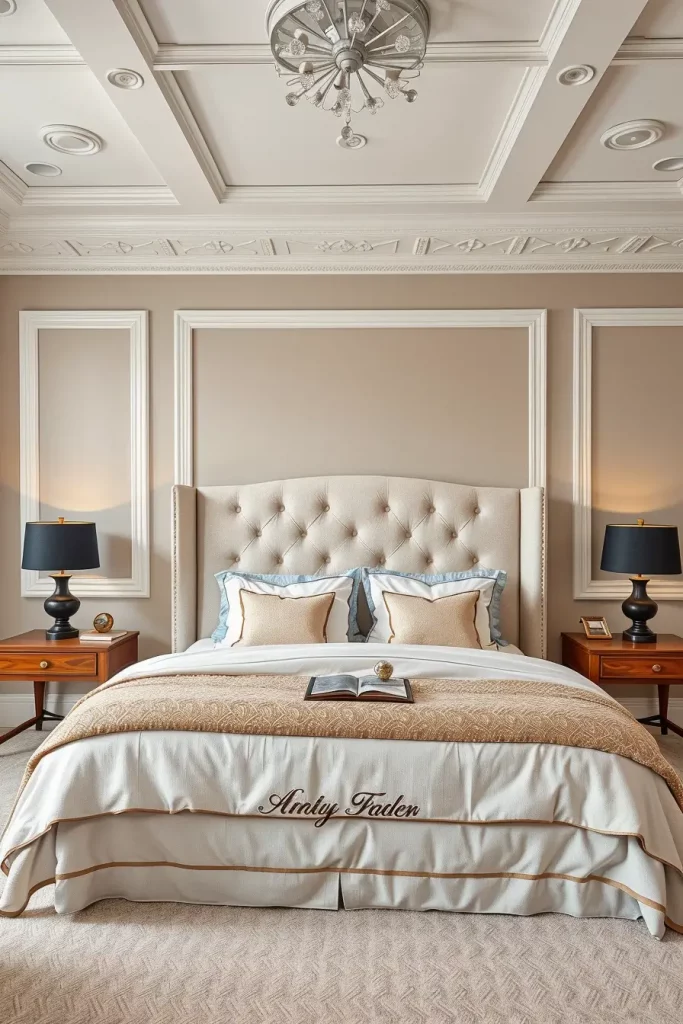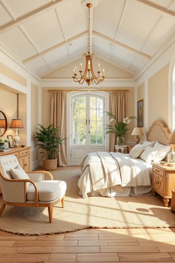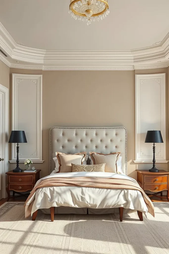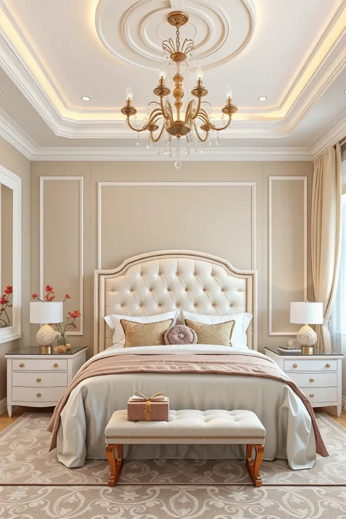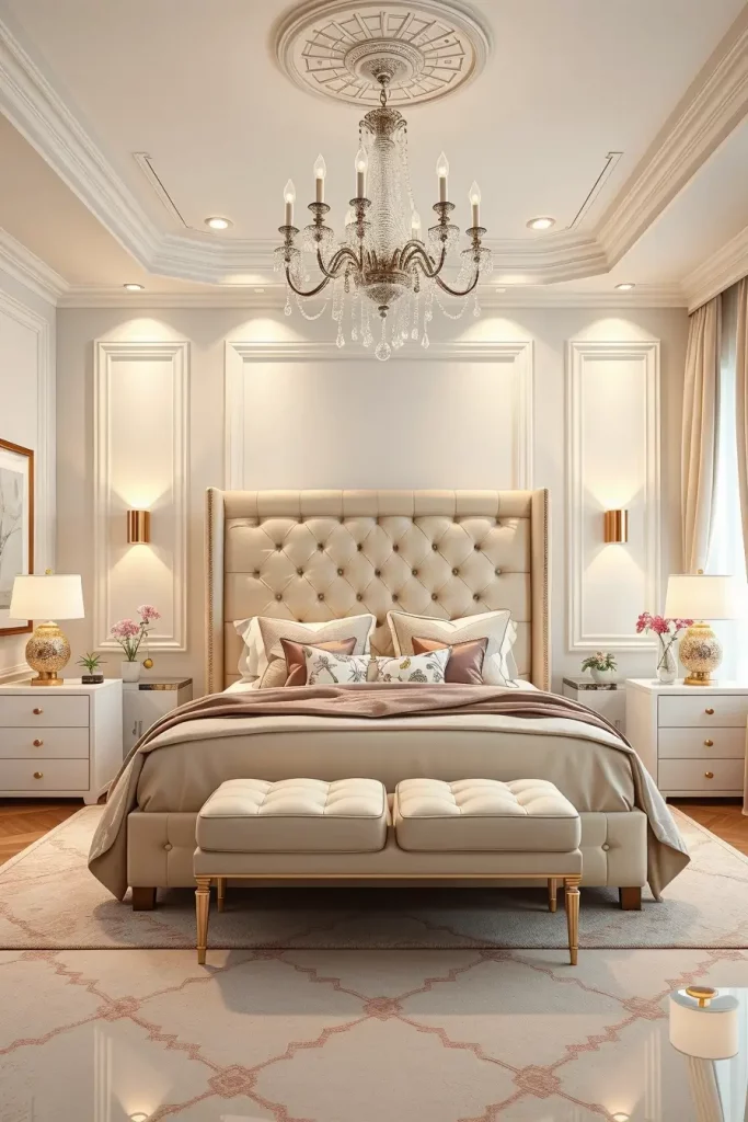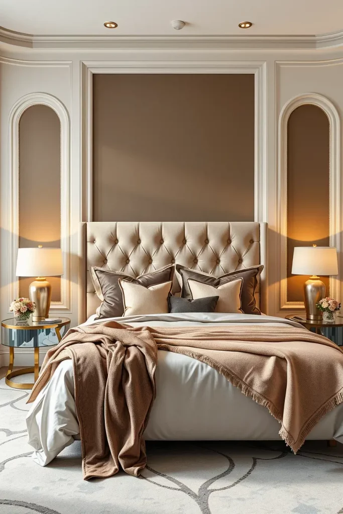 In order to achieve this appearance, I tend to use champagne walls with sharp white trims and ceiling. The furniture should remain in soft neutrals, i.e., a tufted headboard in cream, white lacquer nightstands and a matching upholstered bench at the foot of the bed. Lighting plays a significant role: chandeliers made of crystal or glass and metallic details in rose gold or antique brass will contribute to the enhancement of the softness of the champagne colors.