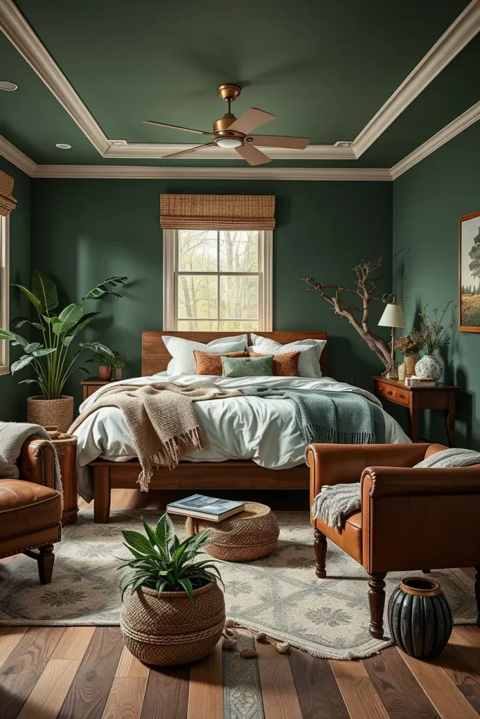 Forest green is a deep earthy color that is becoming popular because of its biophilic properties. This tone is one of the go-tos when it comes to nature-inspired bedroom design in 2025. I usually apply it when the clients are interested in bringing the outdoors inside without resorting to cliche themes. It is rich, classy, and more than versatile.