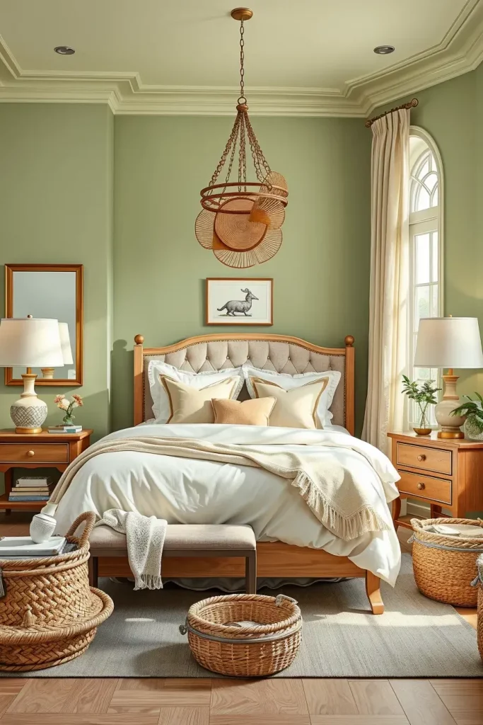 I tend to use this tone on the walls or cabinetry of sage green bedrooms I design, combining it with creamy white bedding and accents of brass or gold. The balance is achieved with a light oak dresser and a similar headboard, and organic appeal is introduced with woven baskets and ceramic lamps. The furniture should be soft-edged and minimal to keep the relaxed atmosphere of the room.