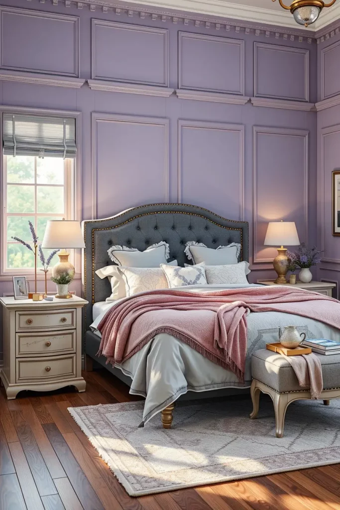In order to implement this, I would suggest matte lavender walls and dove grey wainscoting or paneling. The same should be done with furniture: a grey upholstered bed frame, whitewashed side tables, and a lavender throw or quilt as the accent. The colors are enhanced by the metallic finishing such as brushed silver or dull brass. The whole is brought together in style with a statement light fixture such as a white chandelier with lavender glass.