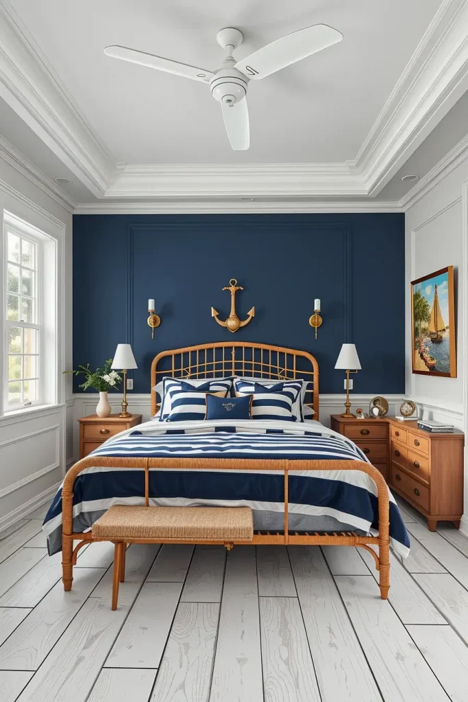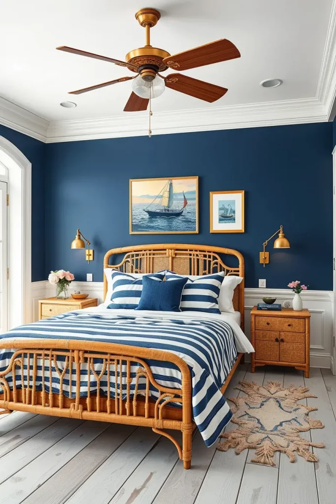 My usual scheme begins with an accent wall in navy blue behind the bed and bright white trims and ceiling. The wood floors are whitewashed and the furniture is made of rattan, giving it an airy beachy feel. The bedding is to be navy and white striped or geometrics to provide a visual rhythm. Brass sconces or nautical-inspired pendant lights take the coastal theme to the next level without being cheesy.