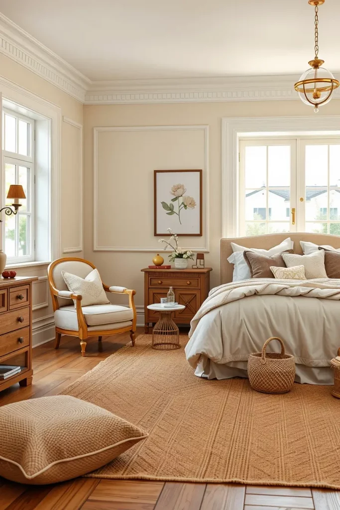 In order to accept this palette, I would recommend beige walls and white or light wood trim. The warm scheme is completed with furniture in caramel or sand tones, e.g. a cane headboard, light linen bedding, plush beige curtains. The texture plays an important role here: boucle chairs, woven baskets, and a jute rug are the visual elements that are not as eye-catching as bright colors.