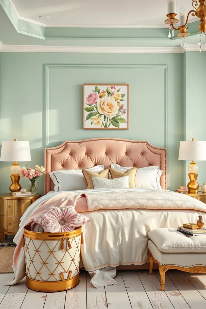 In this arrangement, I prefer the walls to be mint green with blush touches on the decor. The whole thing is tied together with a blush velvet headboard, mint green throw pillows, and ivory bedding. The color palette is kept light and modern with side tables trimmed in gold, rose quartz lamps and transparent acrylic furniture. The airy look is finished with light wood or whitewashed floors.