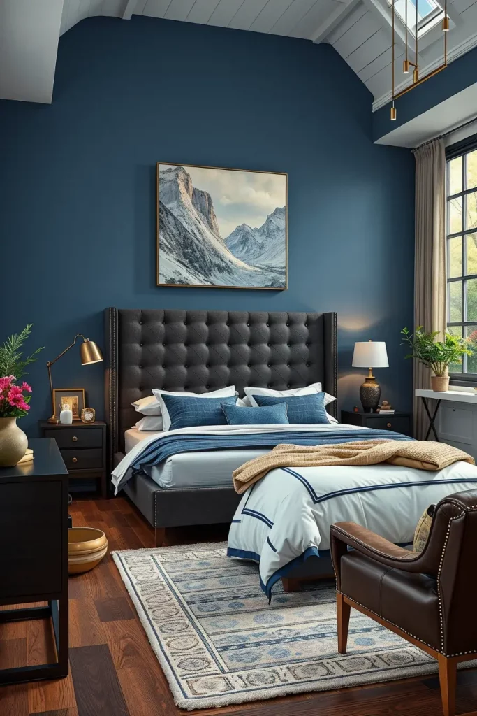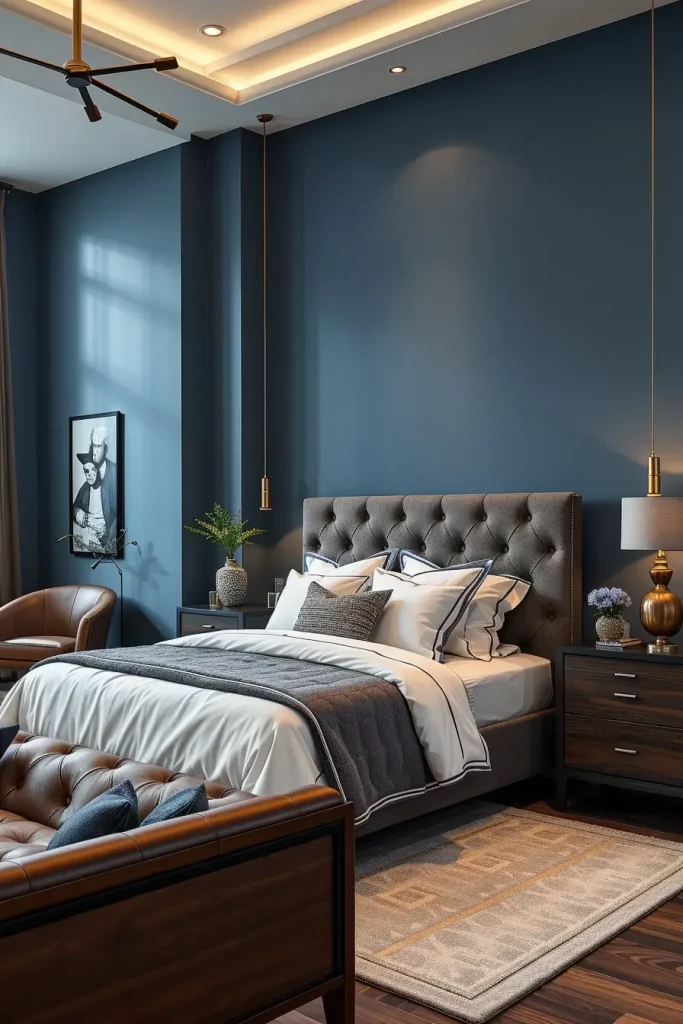 Slate blue is one of the best candidates in 2025 among those who want to obtain depth and relaxation in their bedroom. I often resort to this shade when it comes to bachelor pads and common bedrooms. It is not too deep, not too overwhelming, not too cool, not too sterile, and it is just what is needed to anchor a space.