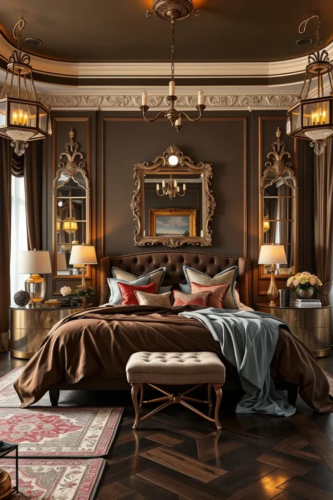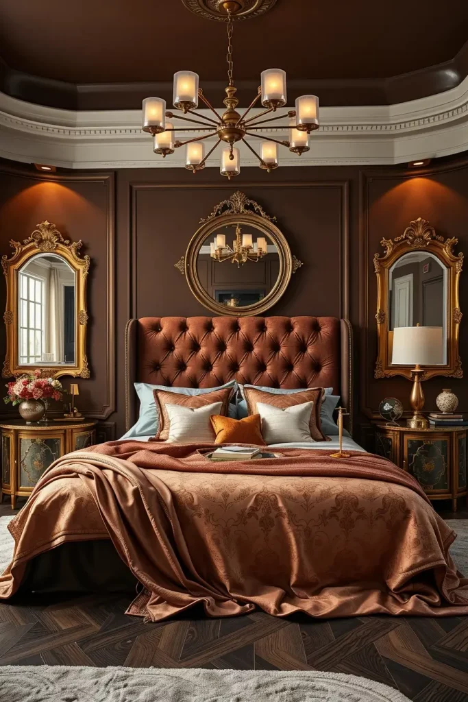 To get the best effect, I would suggest deep mocha walls and bronze-framed mirrors, lighting fixtures, and bedposts. Espresso-colored velvets or leathers should be used in upholstery. The secret is to overlay textures, silk pillowcases, velvet curtains and glossy wood. The headboard is a bronze-tufted fabric or statement headboard.