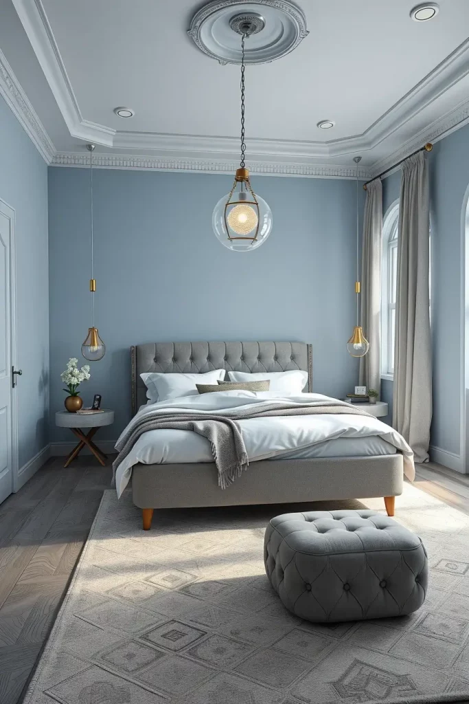 I tend to recommend soft ice blue on the walls, and furnishing and fabrics tend to be dove grey. A grey bed with an upholstered headboard, white side tables, and layered white-and-grey bedding have a light and modern feel. It has frosted glass pendant lights, chrome trim, and minimalistic decor that makes it modern.