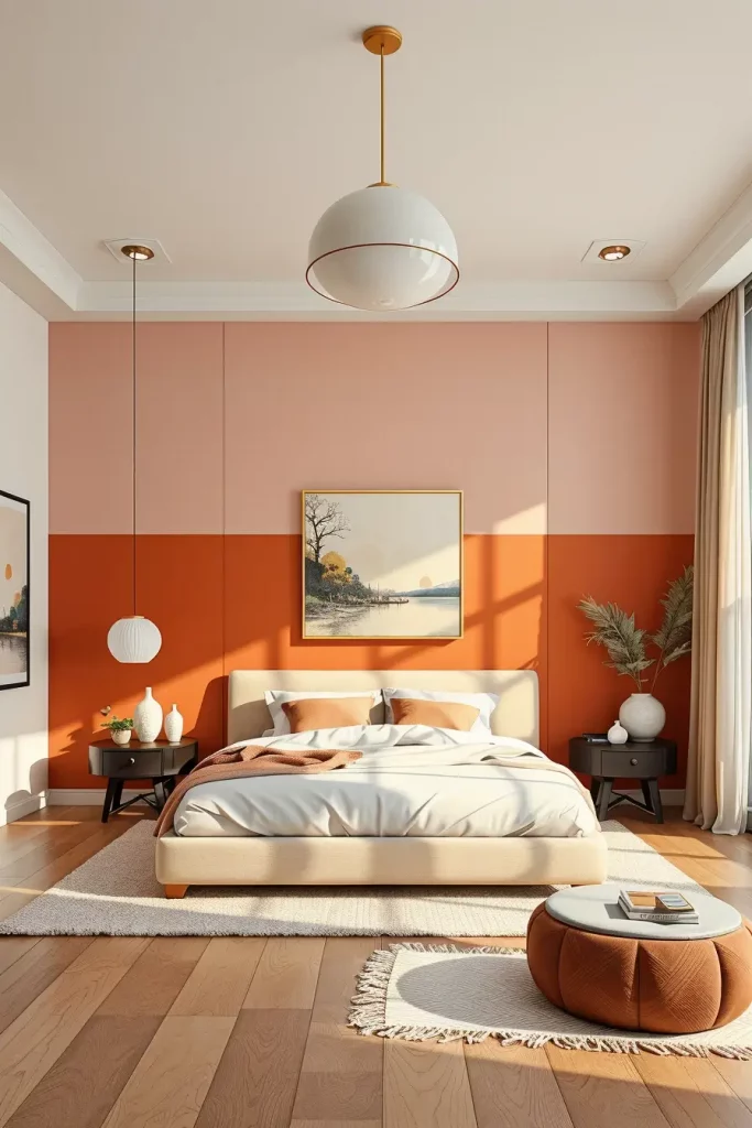 I would recommend splitting a wall horizontally or diagonally, say, dusty rose and terracotta or sage green and stone grey. The color play is anchored by neutral pieces of furniture such as a beige or tan bed. The design is minimal but intentional- large abstract prints, minimalistic wood furniture, and plain light fixtures such as a dome pendant keep things in line.