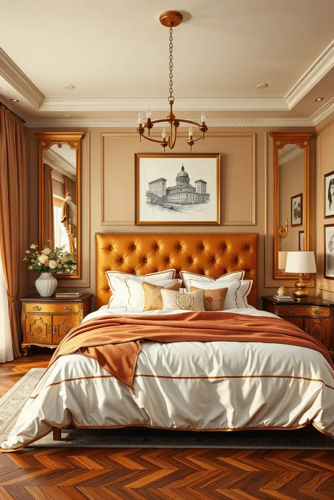 The quiet luxury in 2025 is golden beige with copper accents, which provides chic sophistication without the need of flashy features. The combination of these two is my favorite as it is classic and luxurious. The golden beige is used as a canvas, and the copper gives the bedroom the shine and the feel of being curated and glowing.