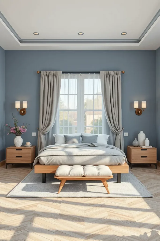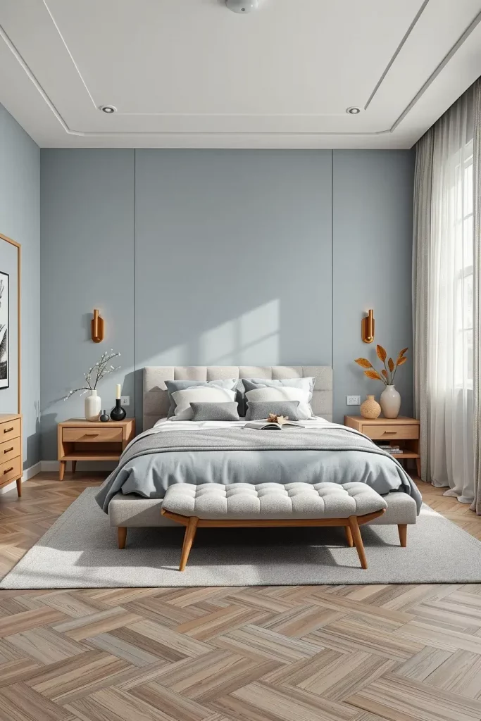 I prefer to combine these colors with plain wood furniture in ash or natural walnut. The low bed, floating nightstands and an upholstered bench in dove grey fabric support the appearance. To complement the ensemble, I would suggest linen curtains that are sheer, ceramic vases in muted colors, and wall sconces with frosted bulbs that will soften the light and scatter it over the matte surfaces.