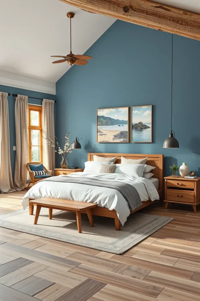 When I design my blue bedrooms, I usually start with a medium blue wall and a clean white bedding and light ash wood furniture. The coastal feel is completed with decorative items like glass vases, artwork with a sea theme, and linen curtains in a faded blue color. I prefer layering the textures such as cotton and canvas to create an interest without breaking the calm atmosphere.