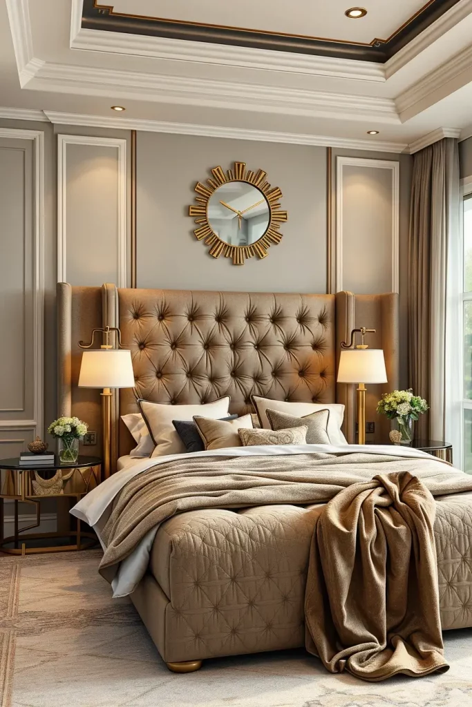 I would generally paint the walls a mid-tone mushroom grey, with ivory fabrics and brushed metal fixtures and fittings. There is a tufted upholstered headboard of a similar tone that adds a bit of drama. I also prefer to bring in mirrored or glass bedside tables to reflect light and give the room some depth.