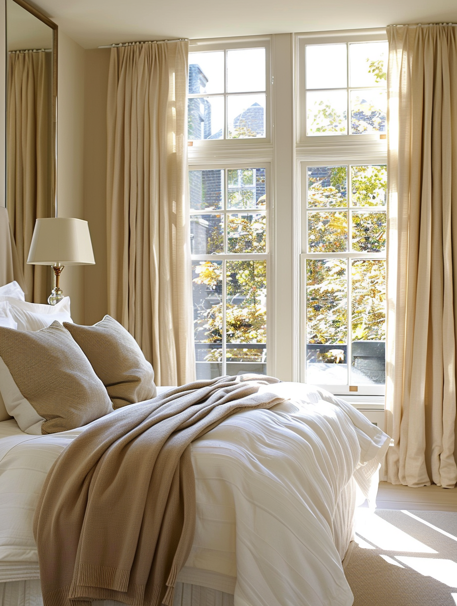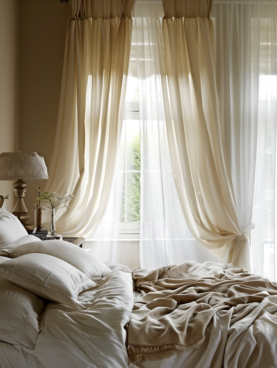 Window treatments are a fundamental part of bedroom decoration as they give people privacy, light control, and an appealing look. Window treatments such as curtains, blinds, and shades are made from various materials, colors, and styles, so they can fit different themes and preferences. You may also want to try thin transparent curtains with thicker blinds to create a flexible and stylish window treatment with elegant taste.