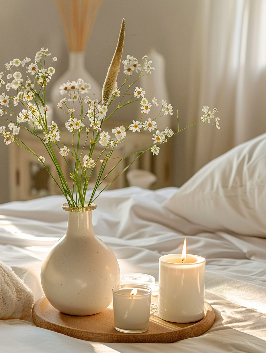 Scent is an indispensable factor in the formation of an atmosphere of tranquility in the bedroom. Scented candles, essential oils, or even natural flowers are your best friends for that scenario of introducing lovely scents into your room. Aromas such as lavender, chamomile, and sandalwood induce relaxation and hence improve sleep.
