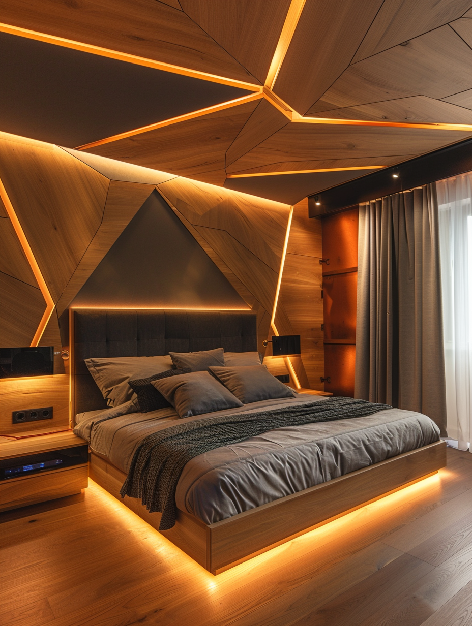 The design of a modern bedroom is focused on simplicity, straight lines, and a monochromatic color palette. Choose the furniture with a minimalist design: pure or simple lines, no additional decoration. Use modern art or geometric patterns to make an impression and to break the monotony. Most modern rooms are filled with high-tech devices and smart home systems to maximize comfort.