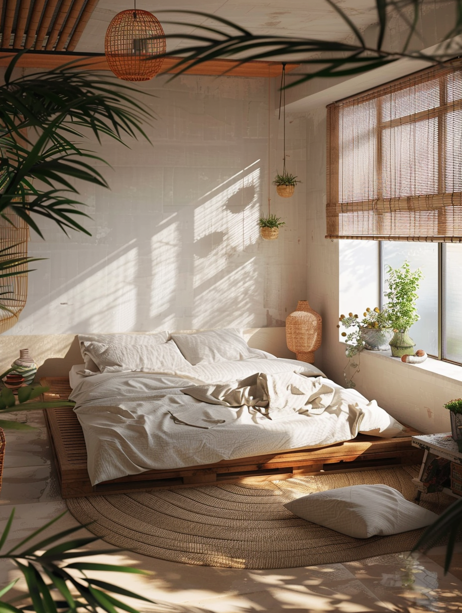 Zen bedroom design is a design that concentrates on making a serene and harmonious environment. A neutral color scheme with natural materials such as wood and stone is recommended. Do not crowd the space and use features like a low wooden bed, natural window coverings, and indoor plants. You can also provide balm, cool lamplight, and scenting oils for a peaceful sound listening.