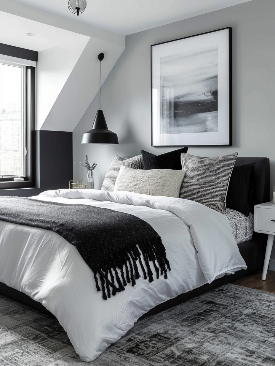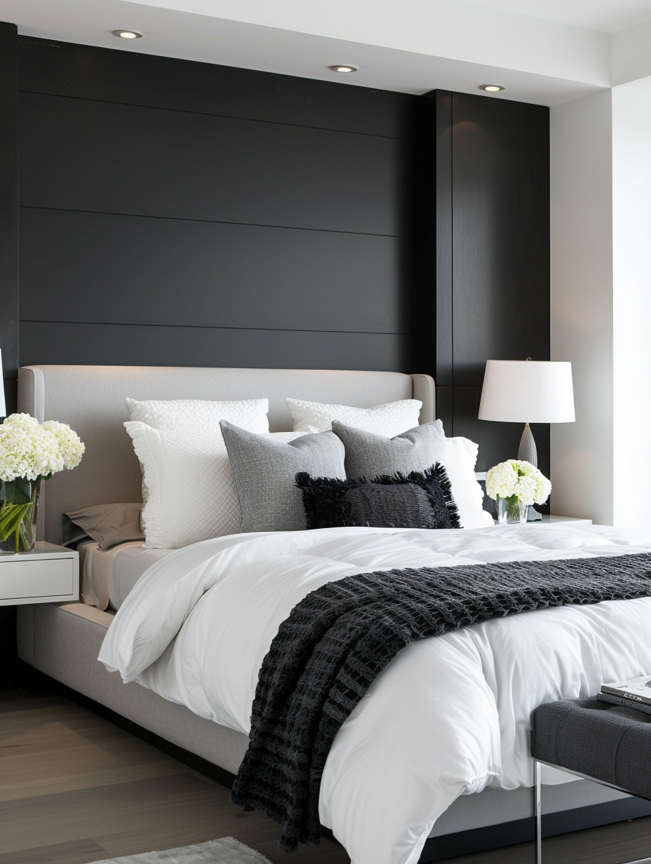 Deciding on the correct color palette is the most important aspect of creating the look for your bedroom. A lot of modern contemporary designs include blue, black, and grey together, which then appear elegant and classic. For an edgier mood, mix in bright cheerful shades such as navy or emerald.