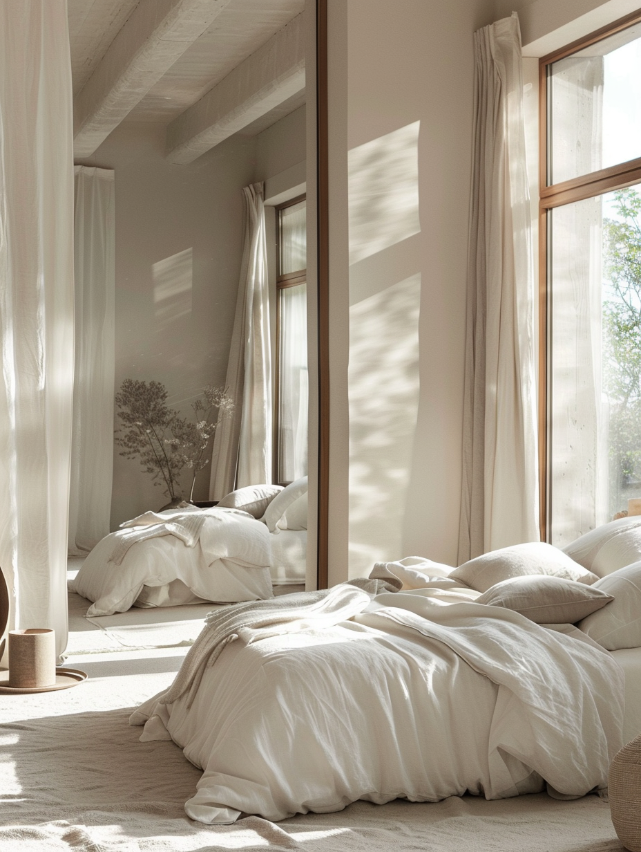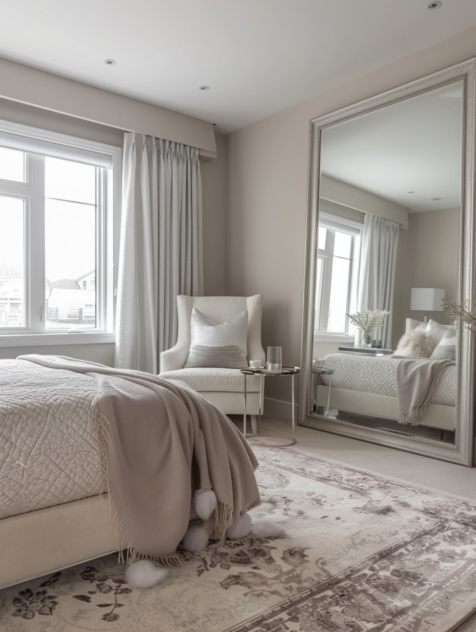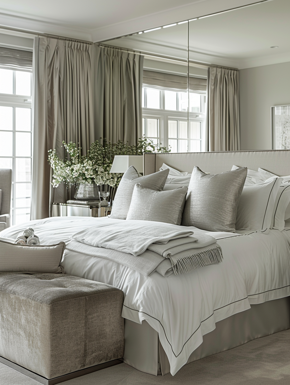 Maximizing natural lighting in your bedroom not just gives it the feeling of spaciousness but also results in a healthier living place. The flow of light that enters the room is enhanced by the installation of big windows and smart location of windows in corners, the white walls and mirrors can reflect light and make the area light.