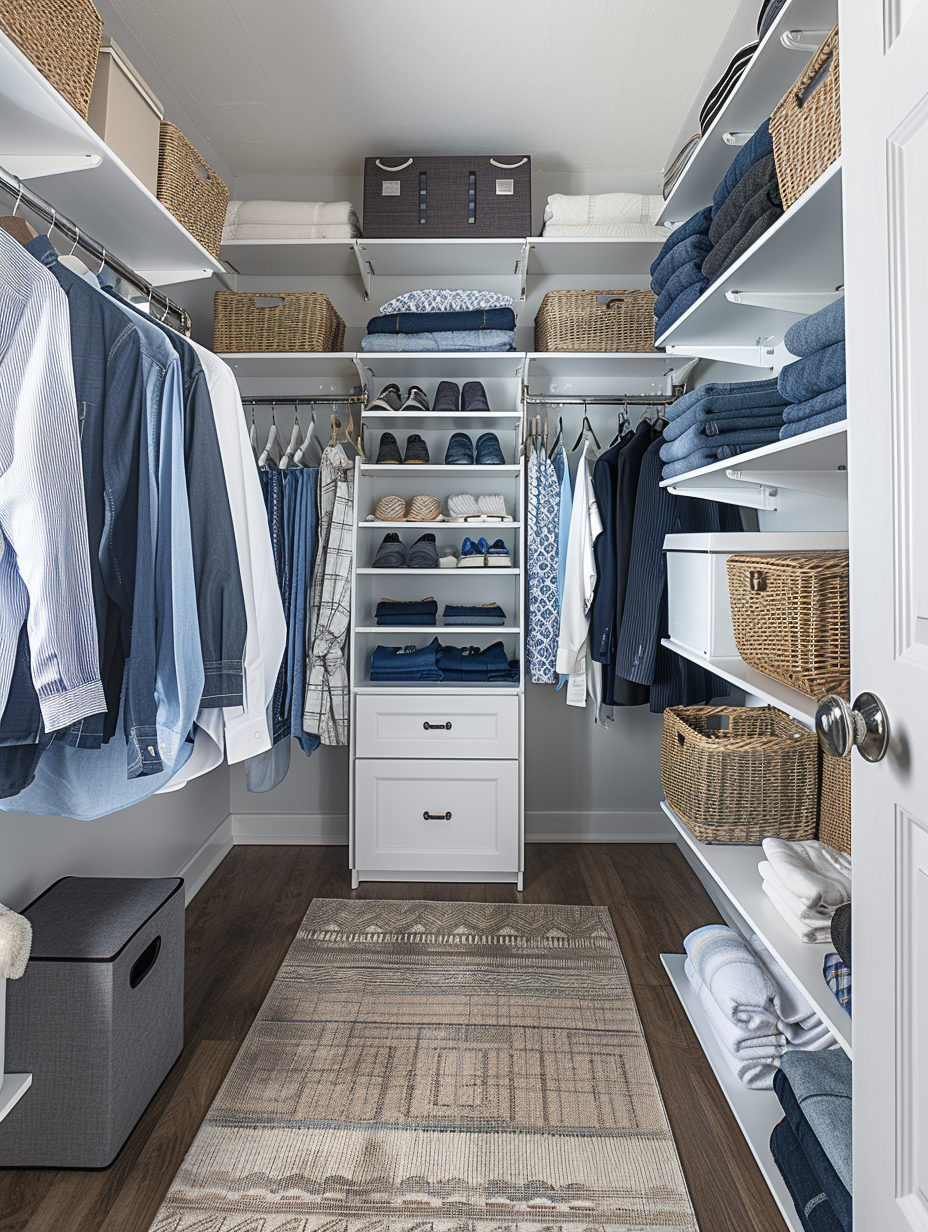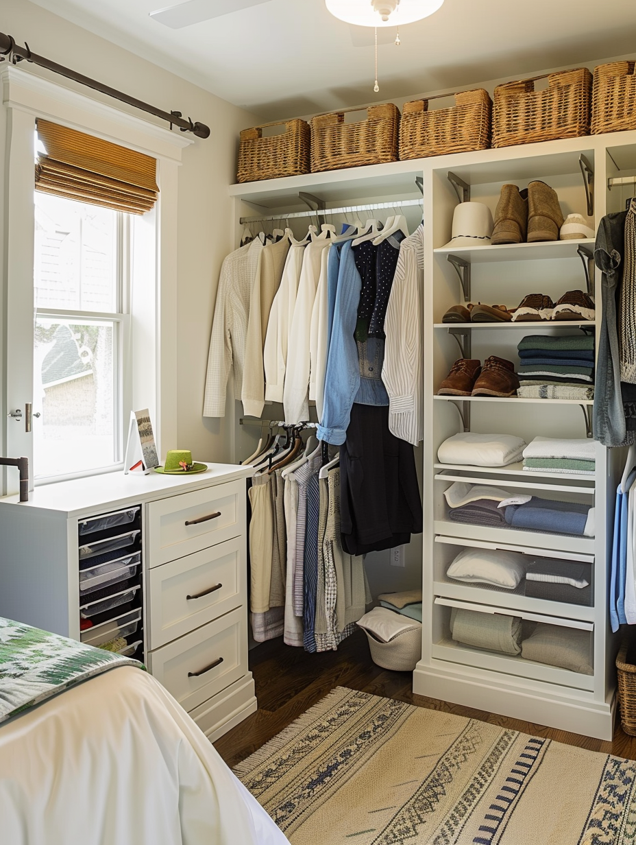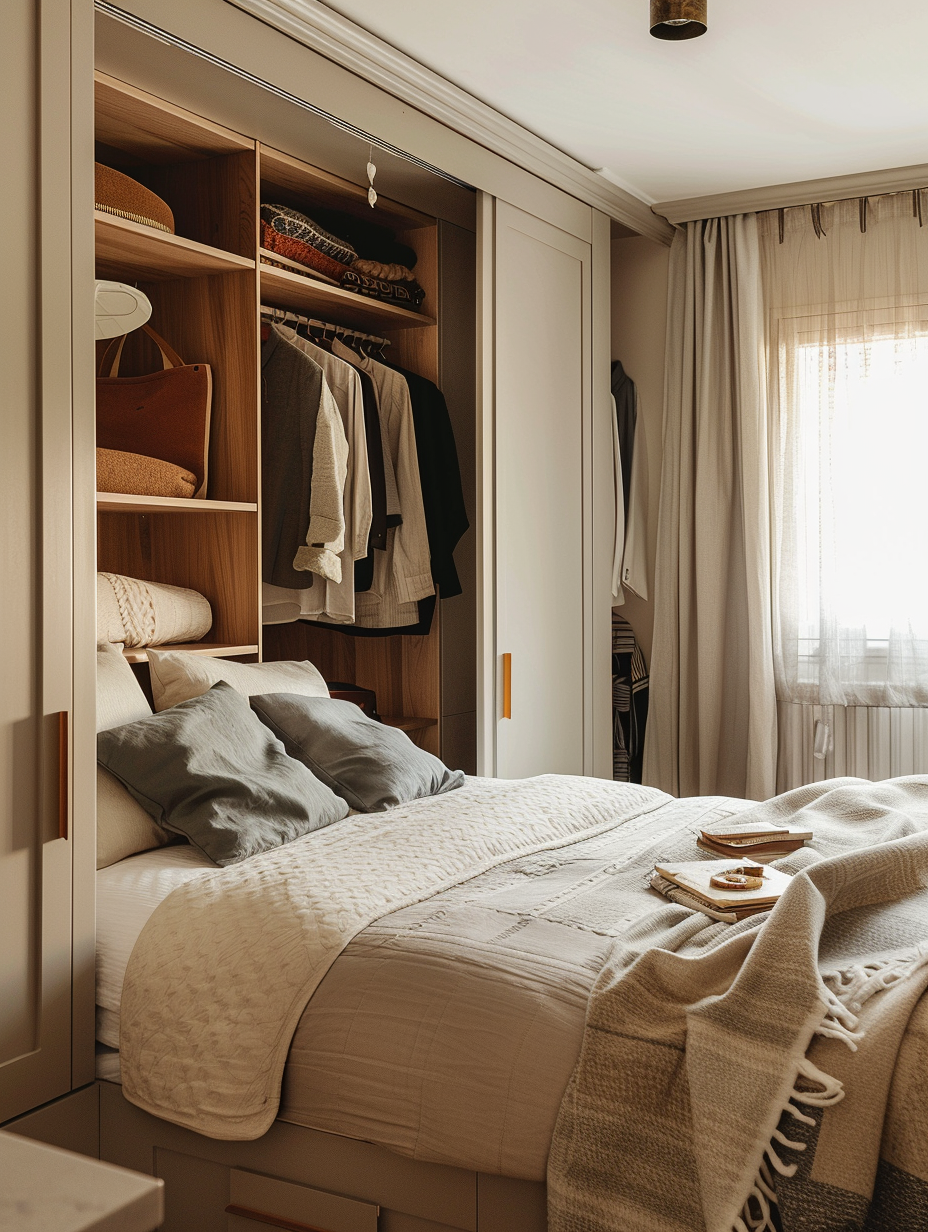 A closet and a wardrobe that are well-ordered can give a space-saving and functional impression to your bedroom. Organize your objects to the best of your ability. Save some area opting for methods like wall mounting (for hangers), shelves, and storage boxes. Get a non-standard-made closet organization to exploit volume and make the stuff handy.