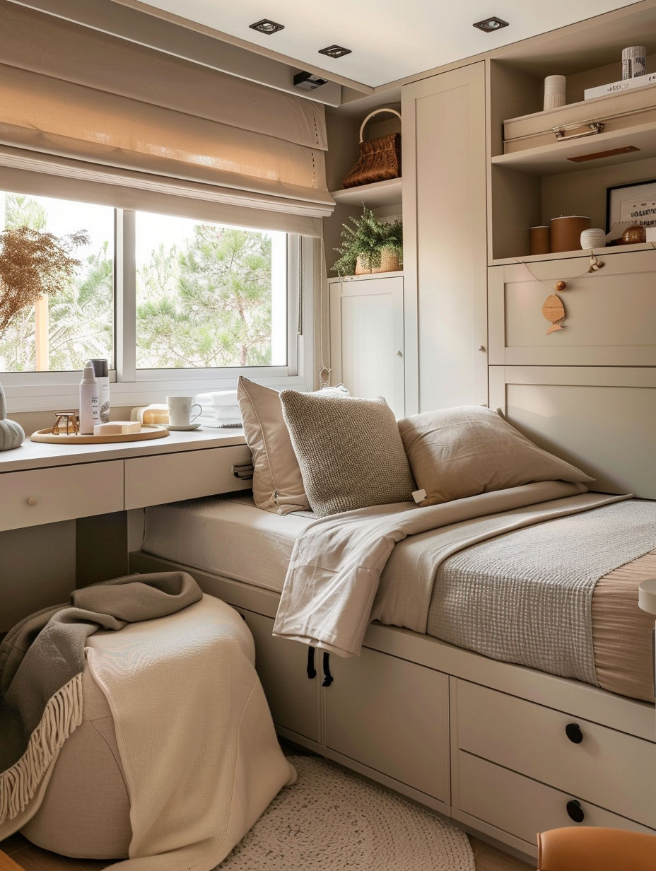 The multifunctional furniture is a real revolution for small bedrooms. One can imagine a bed with drawers, desks that can be used as dressing tables, and an ottoman that can offer hidden storage. They not only have the potential to save space but also help a room become more flexible in its use. So, for example, a bed supplemented with under-bed storage can serve to store extra sheets, clothes, or shoes.