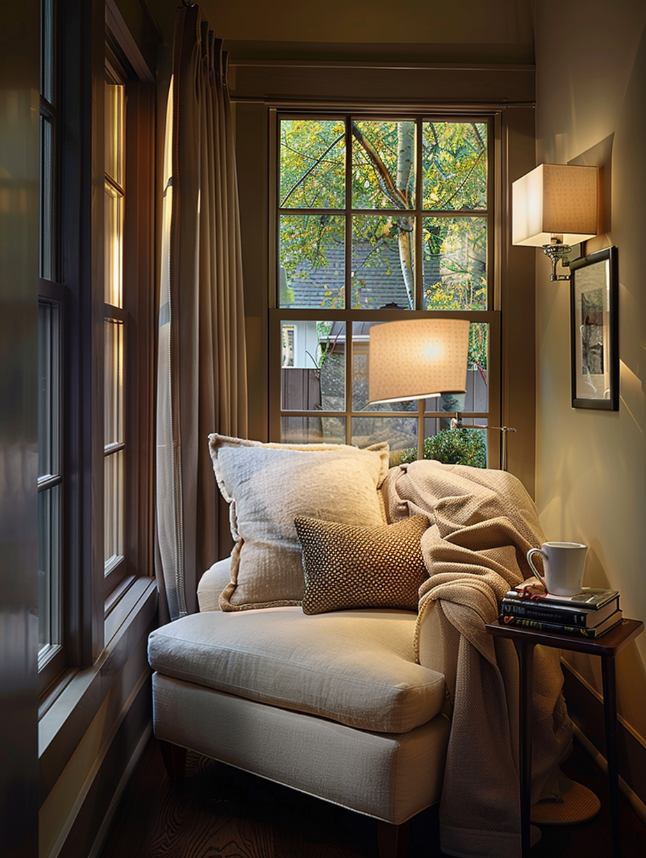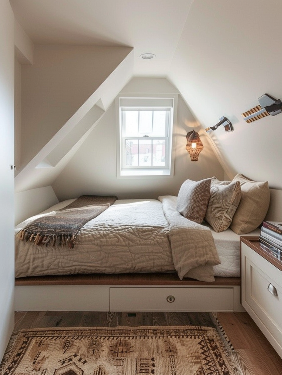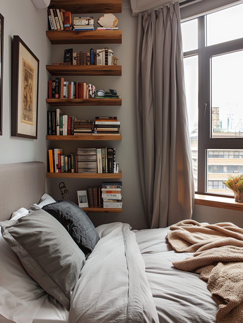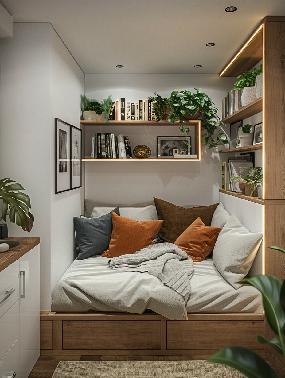 A small bedroom can be made more personal and cosy by adding a reading nook. You can create a comfortable place for relaxation by using a corner or a window seat. A comfortable chair or bench, a small side table, and good lighting should be included in order to make the nook a pleasant place.