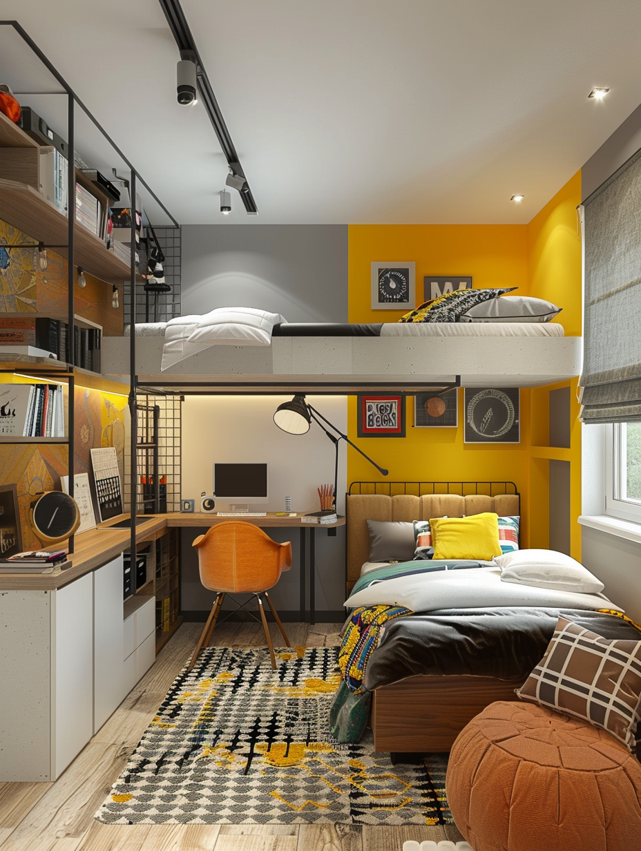 If a bedroom is shared by two or more children or teens, space-saving designs, bunk beds, can be considered. They offer 2 resting places, but only take the space of a single bed on the floor. Nowadays, bunk beds have been upgraded with different properties like building in a desk, shelves, or drawers to provide more space while preserving the efficiency of their design.