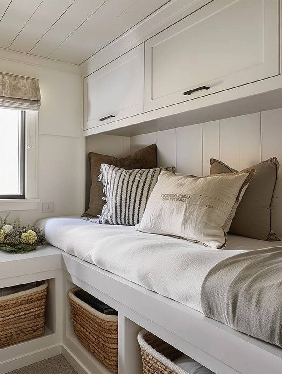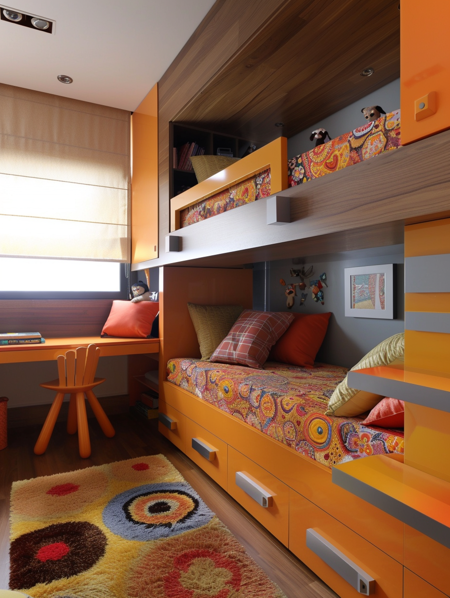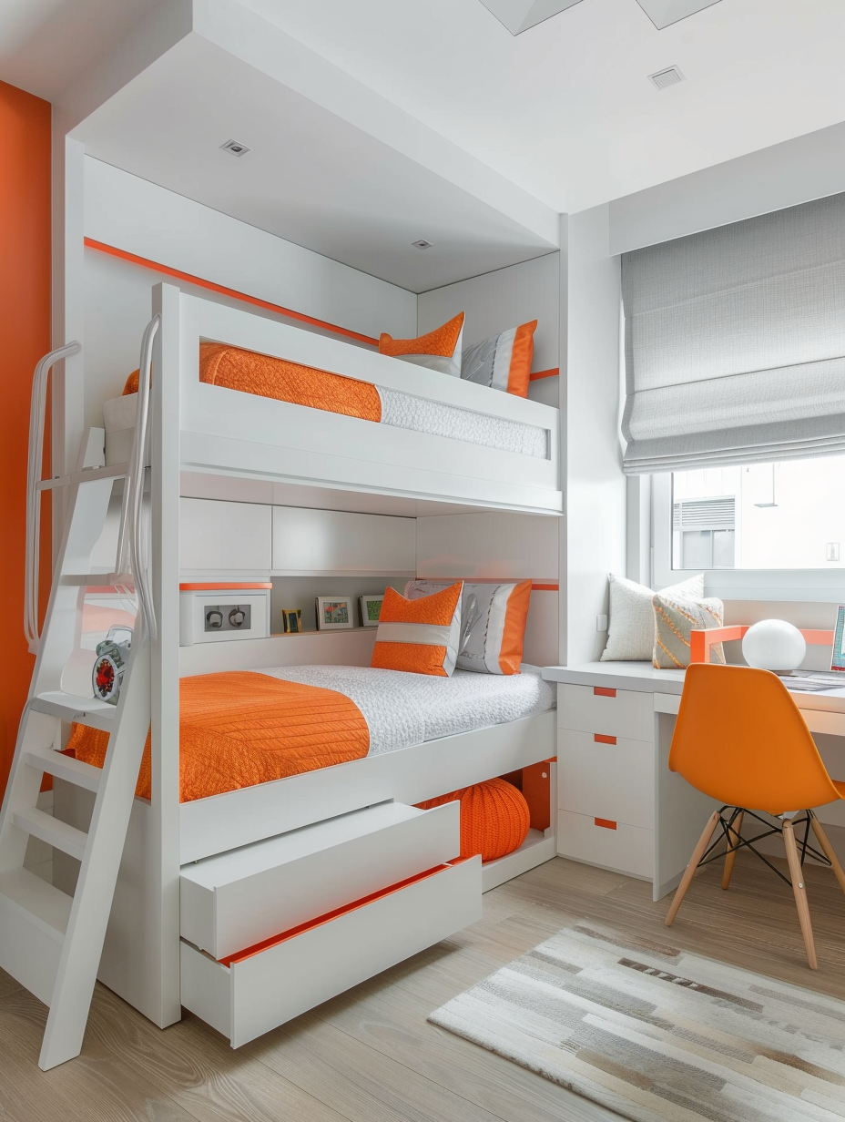 A bunk is a great idea for freeing up more floor space in a small room. One of the ways that you could use the area under the bed is to add a desk, a seating area, or extra storage space. This works the best in small apartments or homes where the older kids or any extra space spared.