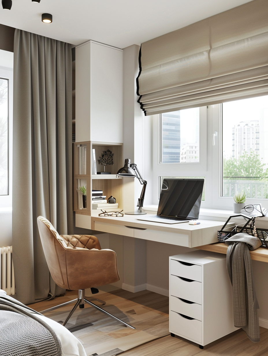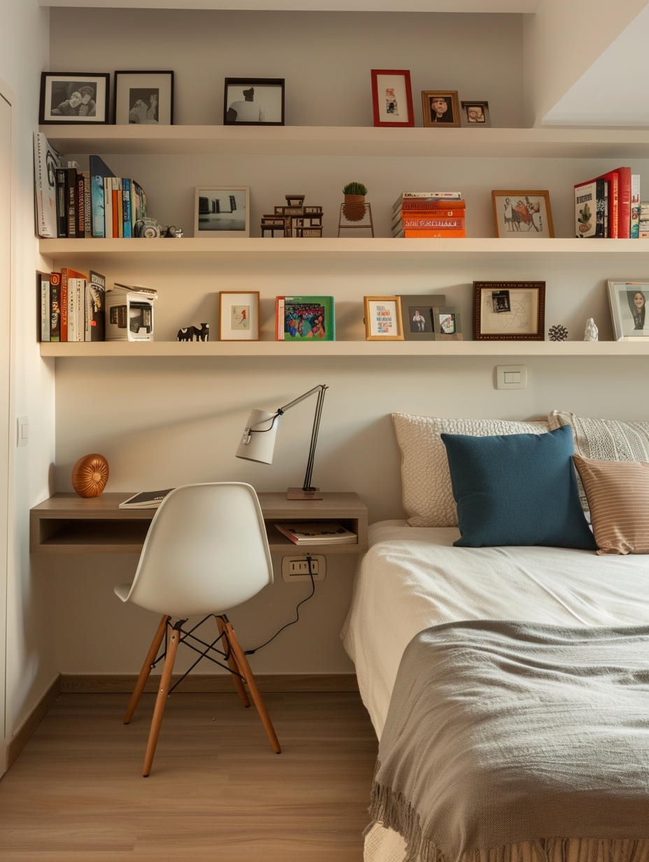 Wall-mounted desks are an excellent option to organize a home office in a small bedroom. They can be folded and hidden when not needed, hence saving space and keeping it tidy. These desks can prove to be good for those who are working from home or are busy with the study, as they offer a separate workspace without dividing the bedroom.
