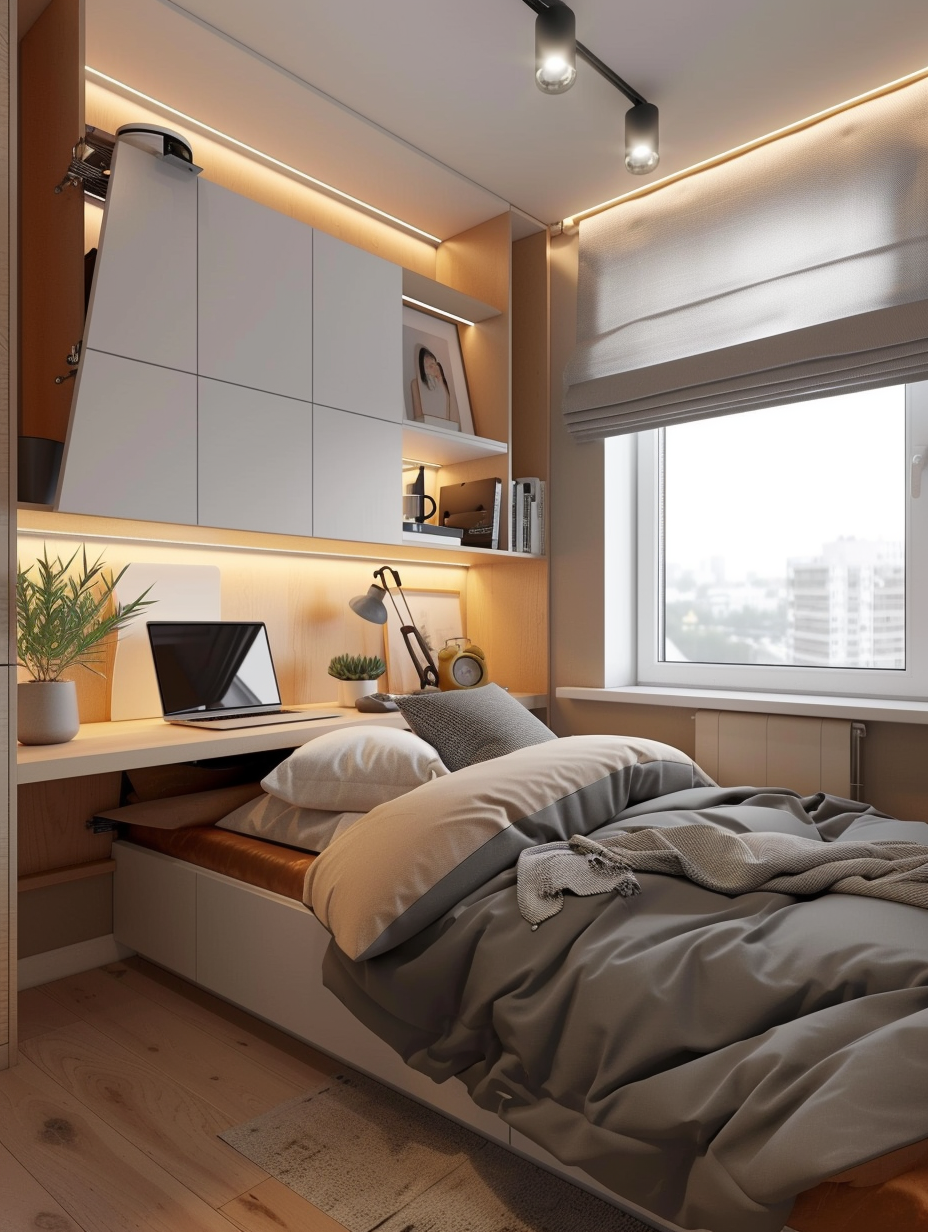 The integration of smart technology into a tiny bedroom can lift the quality of the room. An example of a smart lighting system can be setting the light color and brightness by smartphone or by voice, which allows you to change the light color and brightness without getting up. Smart gadgets, like thermostats, speakers, and also automatic blinds, can give your bedroom the comfort and functionality you want.