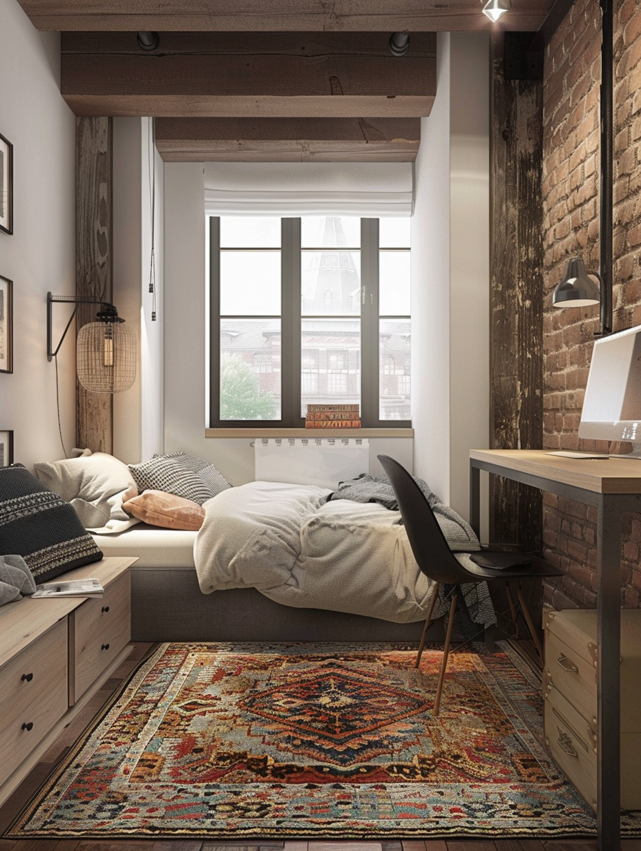 Rugs can be employed to define various spaces within a compact bedroom, for instance, to constitute a sleeping area, a reading corner, or a study area. The appropriate rug selection can imbue the room with warmth and texture, thus giving the space a cozy and inviting feel. Besides, rugs act as floor dividers and thereby the rooms become separate sections in one big area.