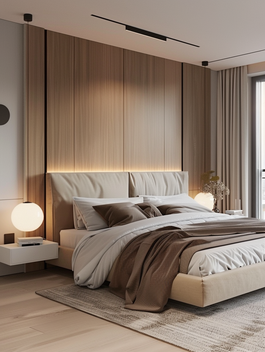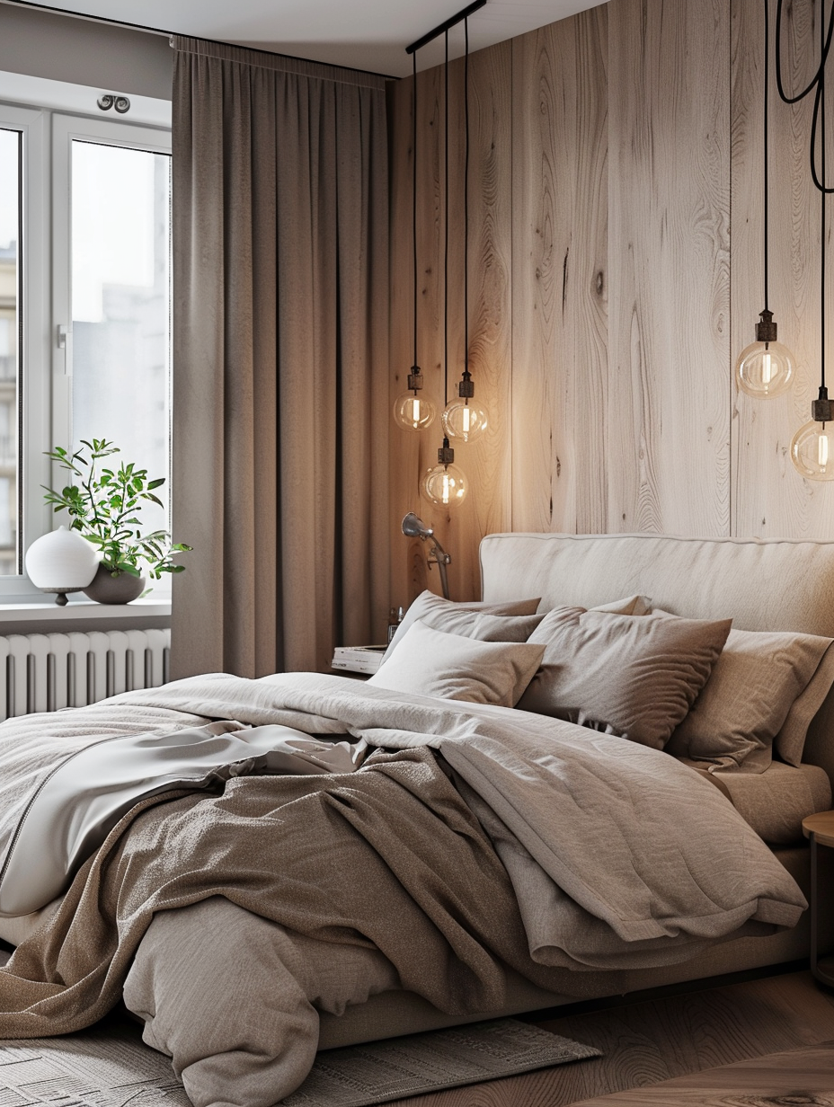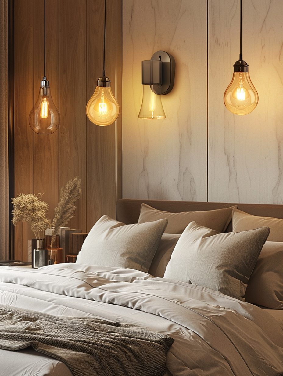Bright, spacious light is indispensable in the bedroom. Plan several layers of lighting, for example, ambient, task, and accent lighting, to light the space correctly and make it a welcoming room. Setting the mood and creating an ambiance can be done using light. Wall sconces, pendant lights, and table lamps are also great choices to bring a balanced and functional lighting scheme.