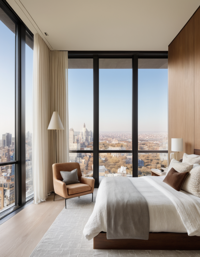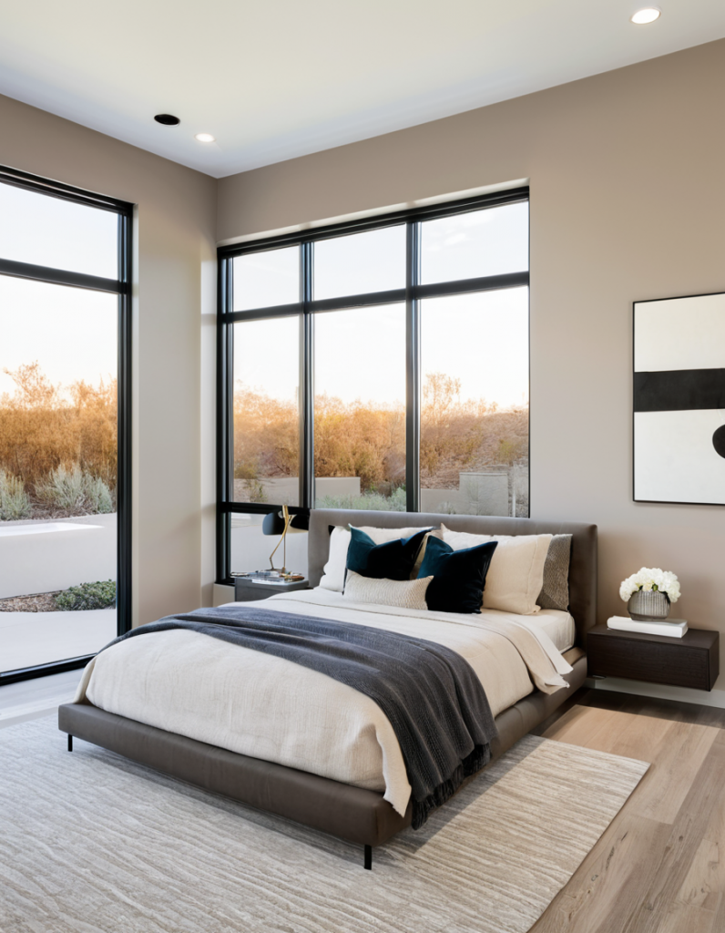 Natural light is a very important element of the contemporary bedroom design, and long before 2025, large windows became rulers of space transformation into open, airy, light-filled spots. No matter whether they are floor-to-ceiling or broad picture windows, they throw a beam of the outside in, thus the room looks cheerier and the bond with nature becomes stronger. In rooms where privacy may be a problem, light-filtering curtains or blinds may be added for a natural light privacy balance. The main purpose of this design is clarity, for the box outside becomes part of the room’s decor.