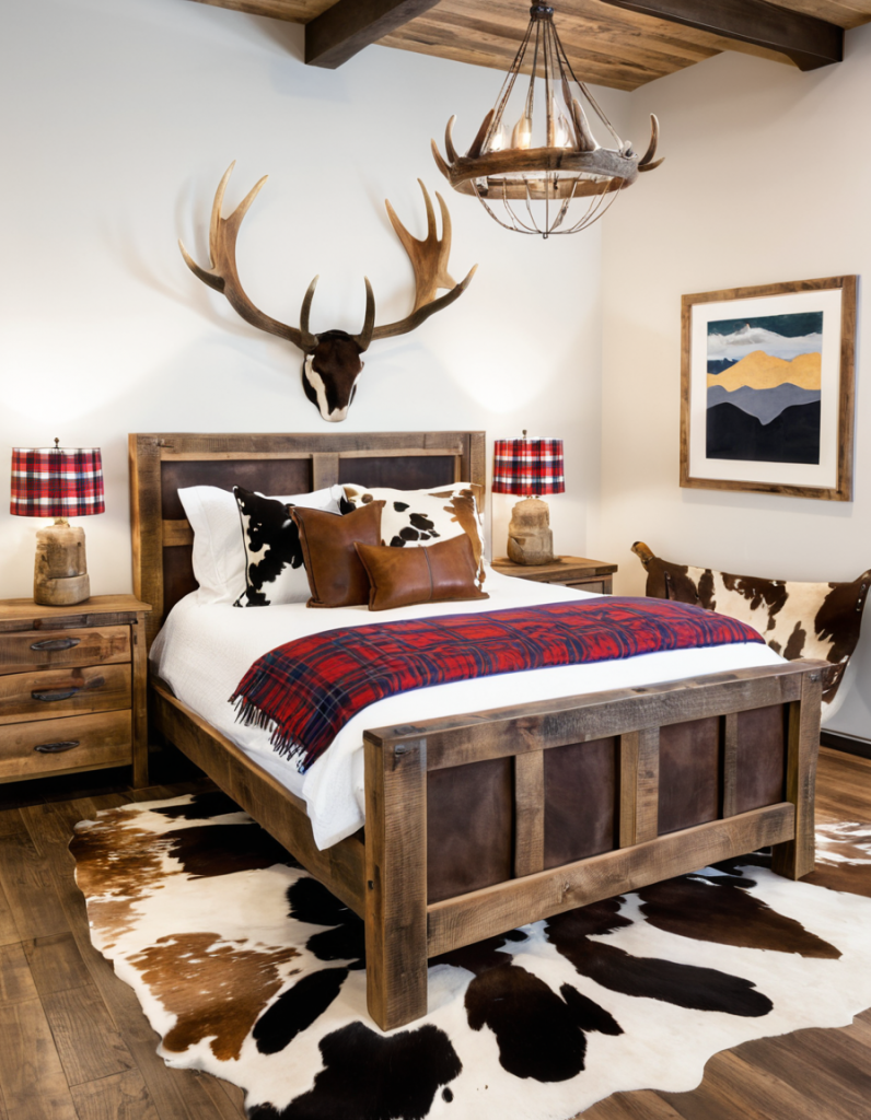 Transform your home into the raw beauty of a western town by creating a western-inspired bedroom. The 2025 trend combines materials such as reclaimed wood and leather with traditional western motifs namely horseshoes, cowhide rugs, and earthy color palette. Furnishing usually is made of distressed wood, plaid is used in other textiles and focal pieces can be wrought-iron bed frames, and antler chandeliers. This particular décor style is suitable for those who wish to establish an ambiance that is both warm, weathered, and typically rustic.