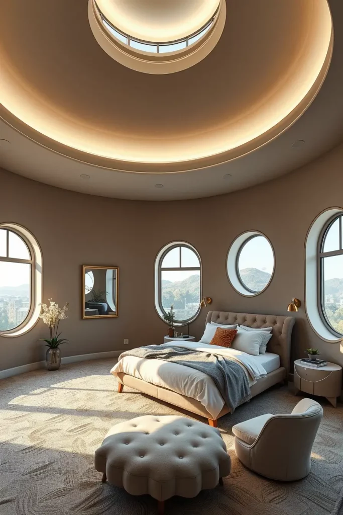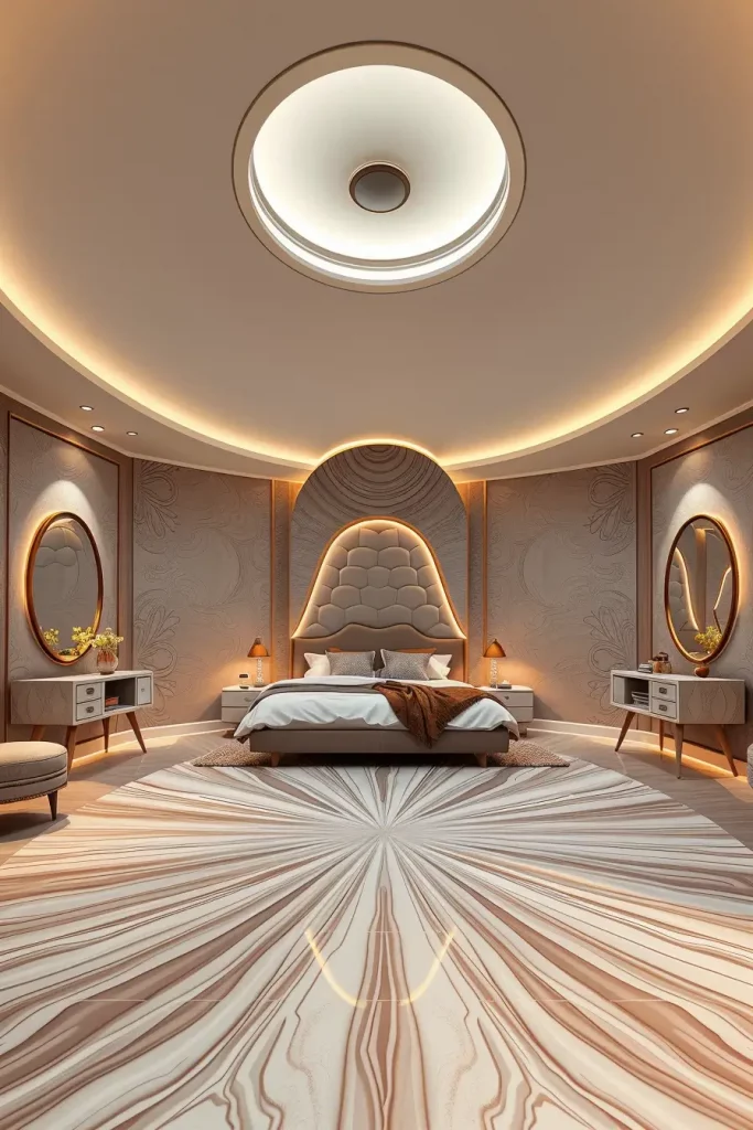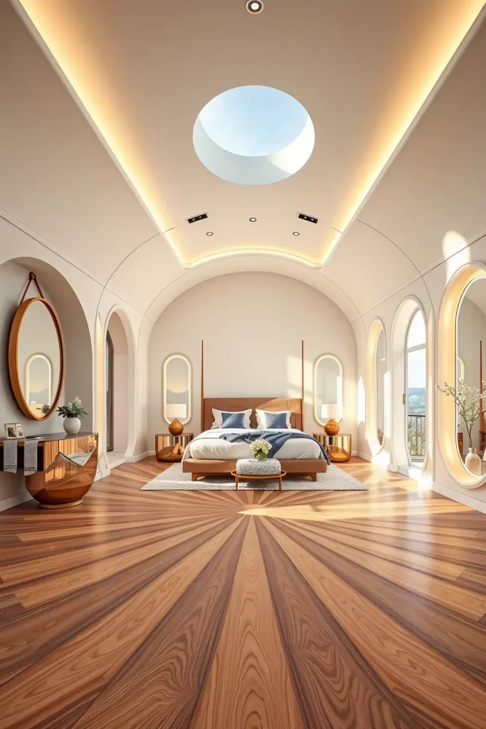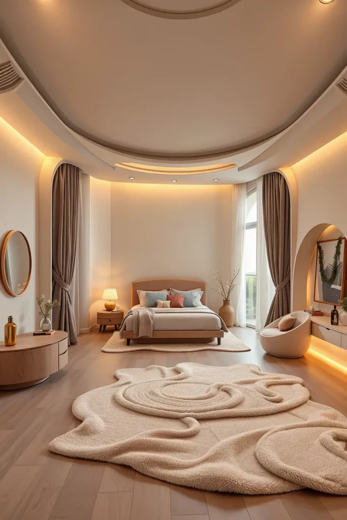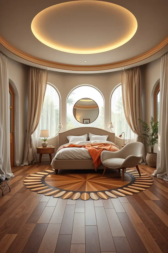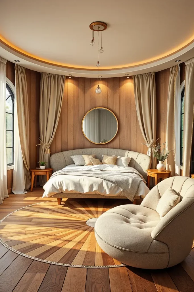 I prefer curved bed frame, circular shaped mirrors and flowing window curtains to fit the curves of the room in such designs. No angular artworks are required- organic sculptures or wall-mounted circular lights will help to finalize the room. Radial lines promote space unity by floor materials like polished concrete or continuous planks of wood. Round ottoman or lounge chair, which is crescent-shaped, offers a place to put down a foot simply without interrupting the rhythm of the room.